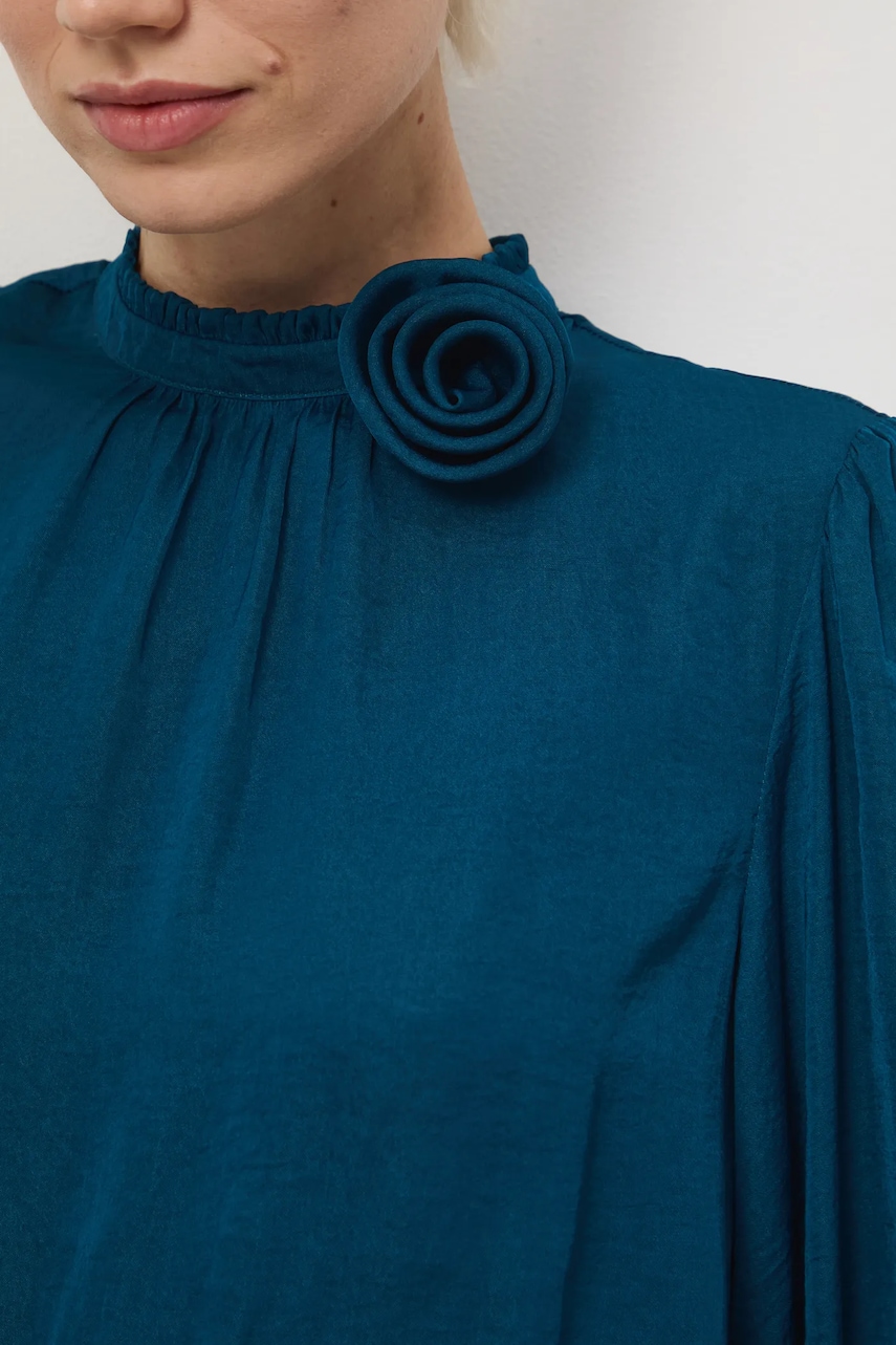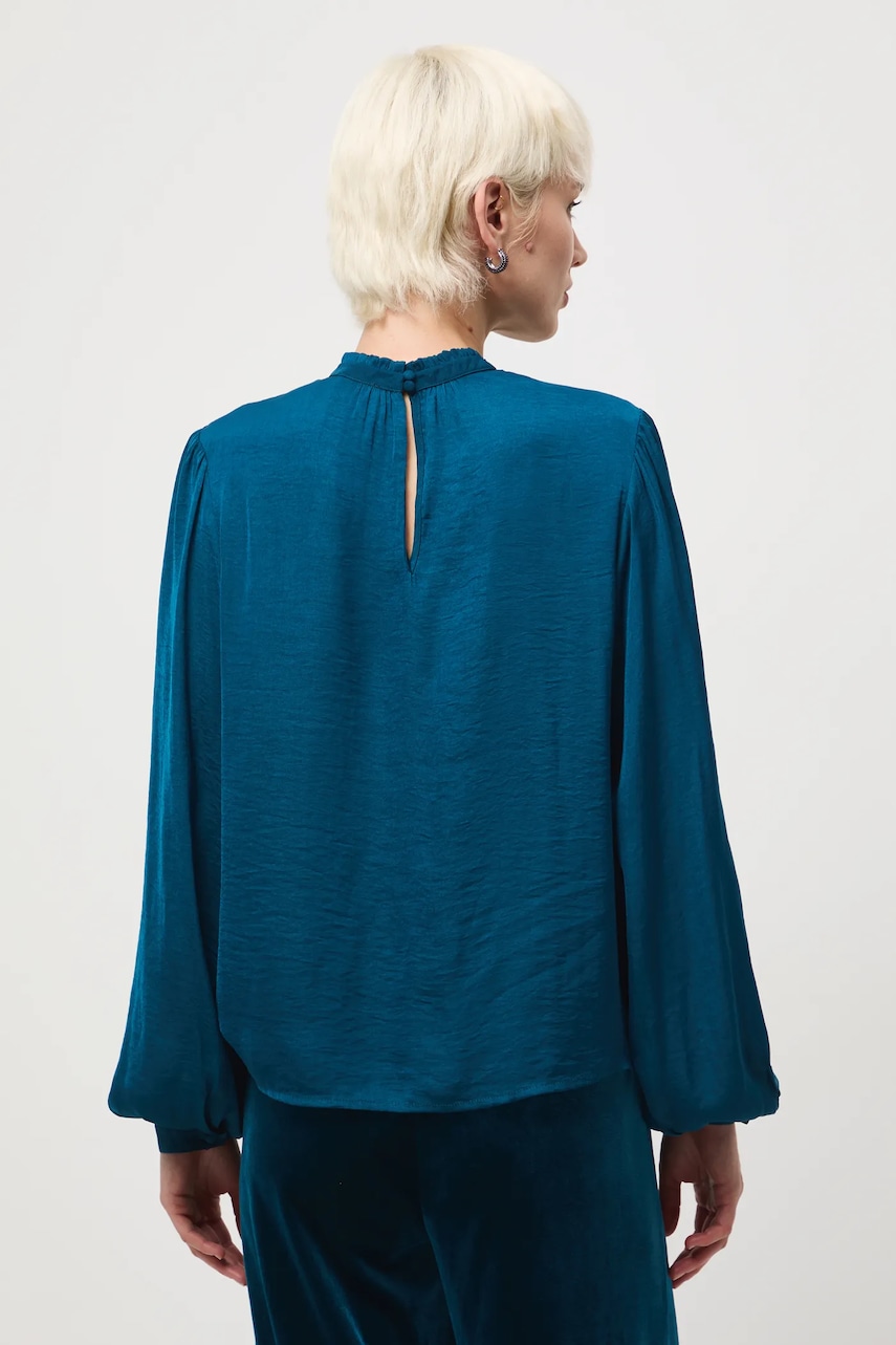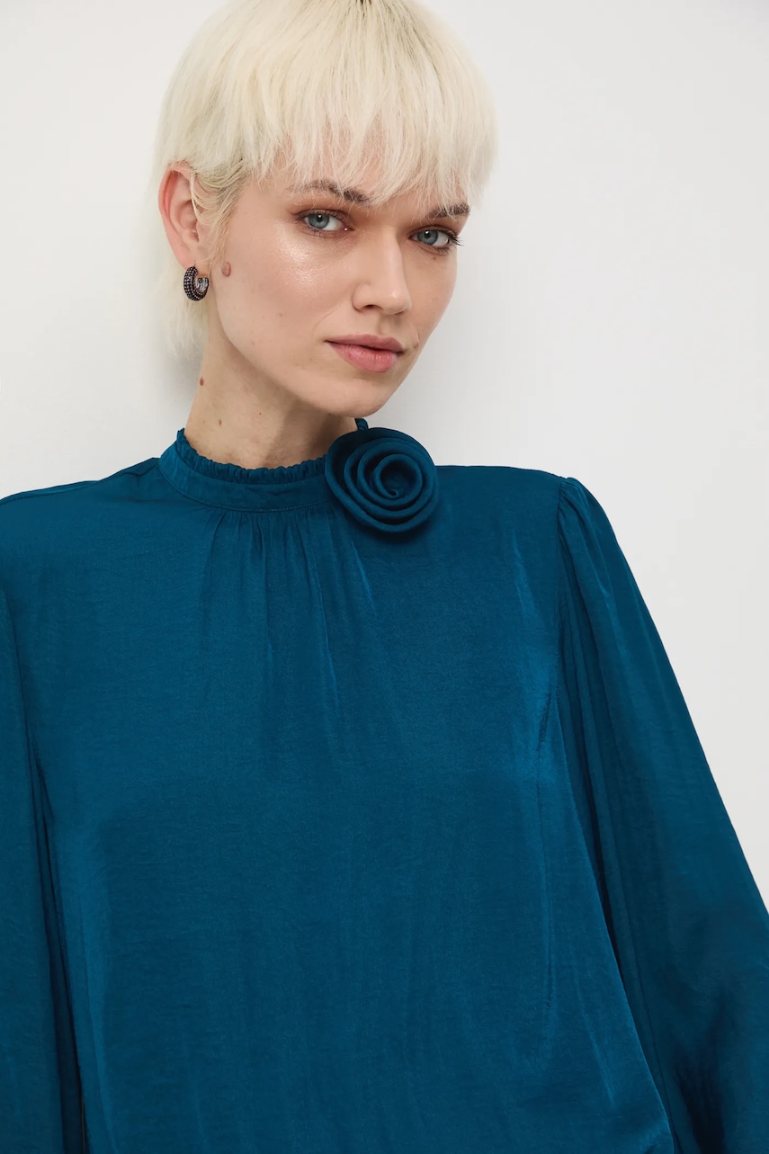 - Fason regular. - Długie, bufiaste rękawy. - Mankiety zapinane na guziki. - Model ze stójką. - Z tyłu zapięcie na guziki. - Ozdobne marszczenia. - Ozdobny element w kształcie kwiatu. - Gładka tkanina. - Ozdobne wstawki. - Długość rękawa: 66 cm. - Długość: 65 cm. - Szerokość w biuście: 51,5 cm. - Wymiary podane dla rozmiaru: S.