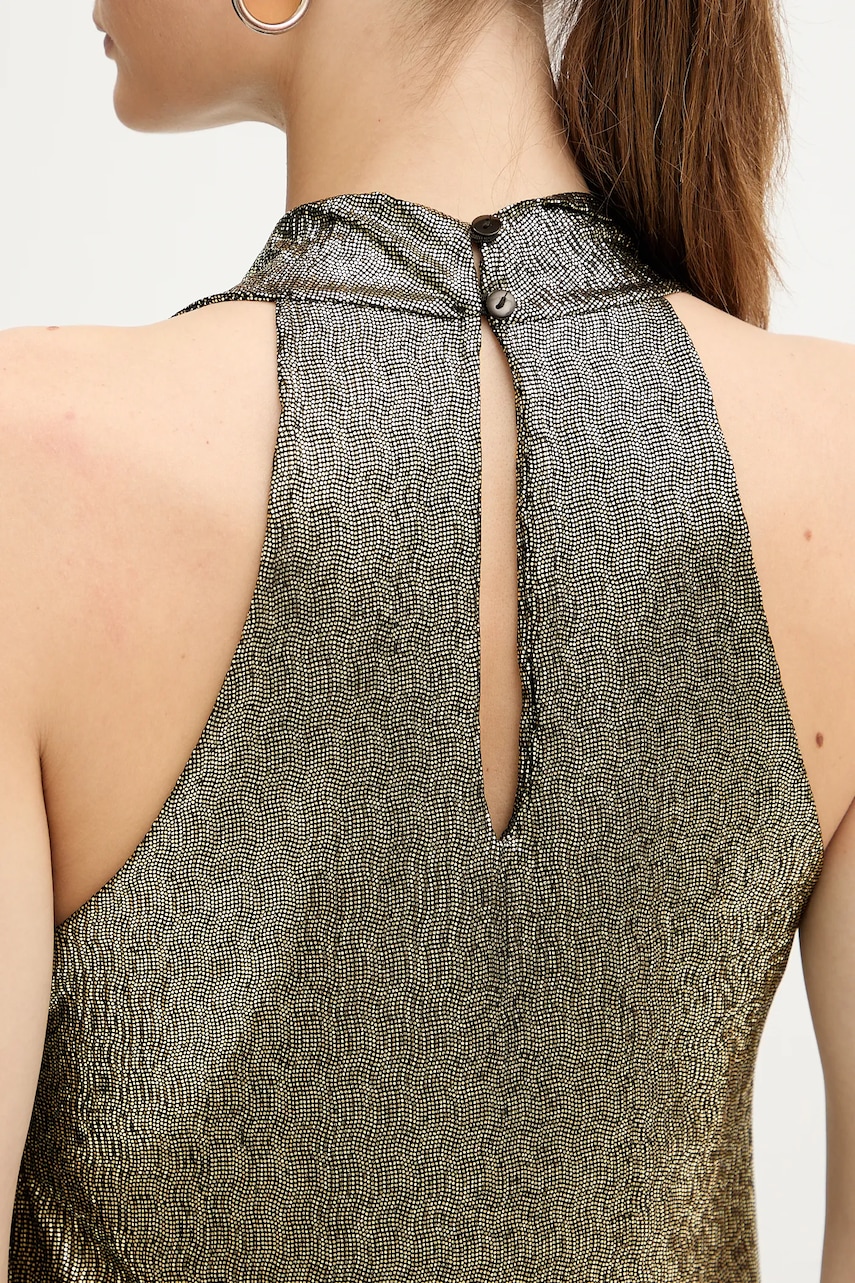 - Prosty, nie blokujący ruchów fason. - Efektowny dekolt typu woda. - Z tyłu zapięcie na guziki. - Długość: 60 cm. - Szerokość pod pachami: 43 cm. - Wymiary podane dla rozmiaru: S.