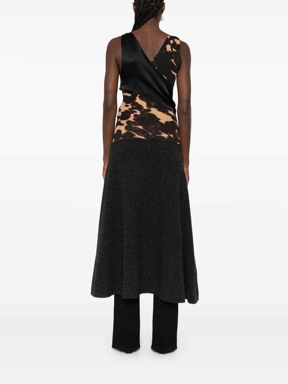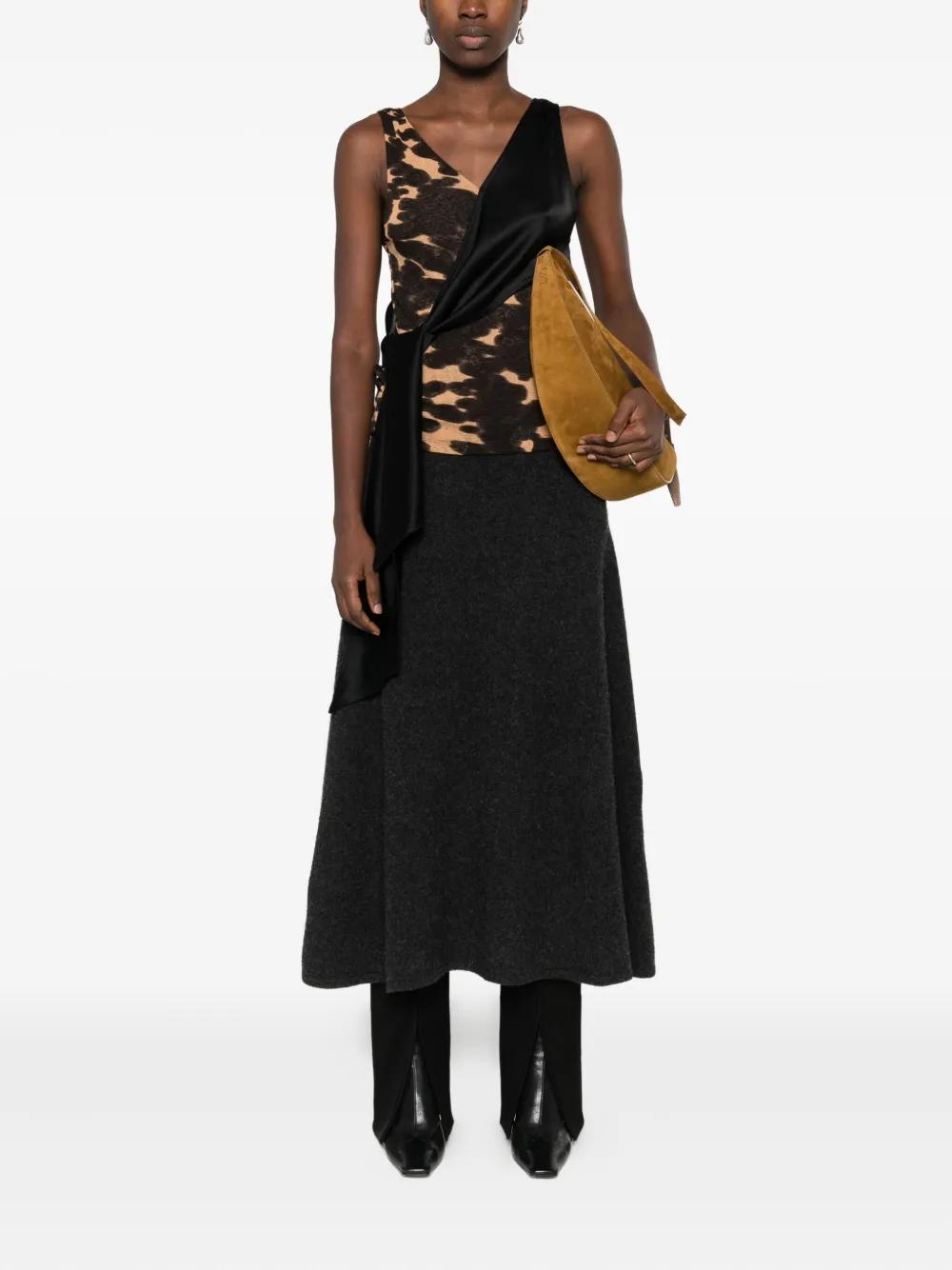 midnight, mocha, apricot and black abstract print asymmetrical neckline sleeveless self-tie belt V-neck