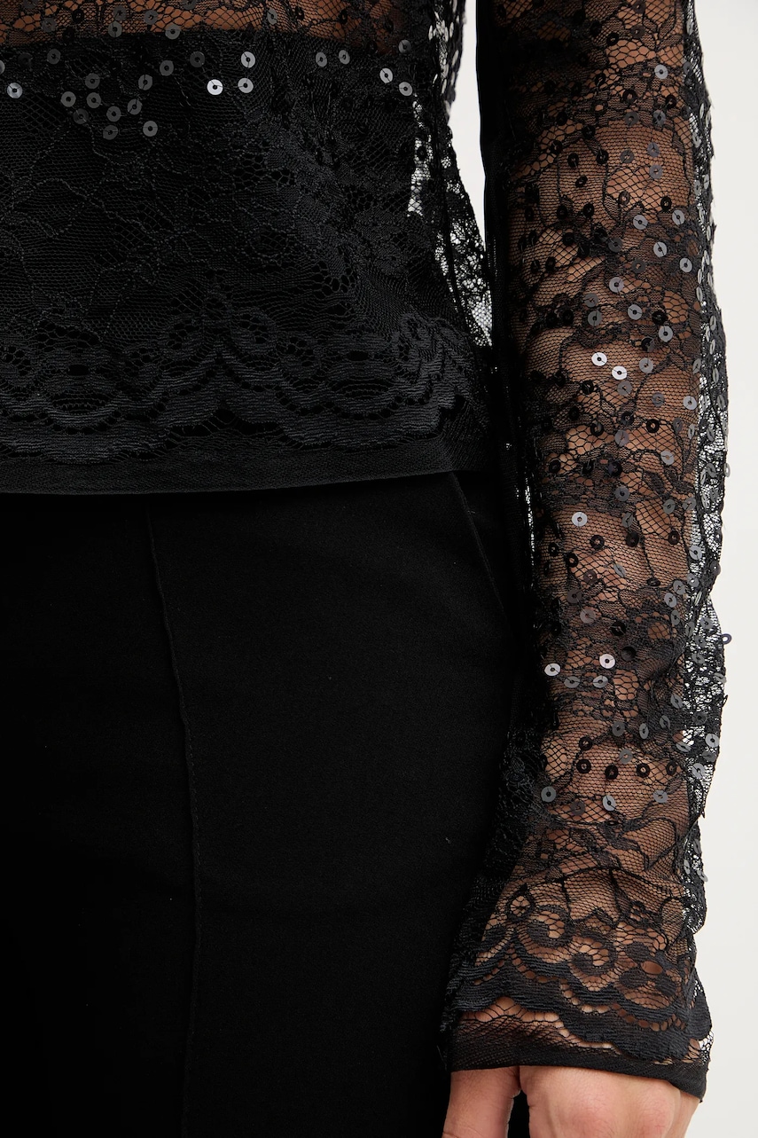 - Model z linii Go Green, wykonany z włókien, wyprodukowanych przy użyciu zrównoważonych procesów produkcyjnych, zmniejszających tym samym ich wpływ na środowisko - Prosty, nie blokujący ruchów fason. - Klasyczny, okrągły dekolt. - Długi rękaw. - Model z cekinowymi wstawkami. - Model wykonany z transparentnego materiału. - Długość rękawa: 74 cm. - Długość: 56 cm. - Szerokość pod pachami: 47 cm. - Wymiary podane dla rozmiaru: 36.