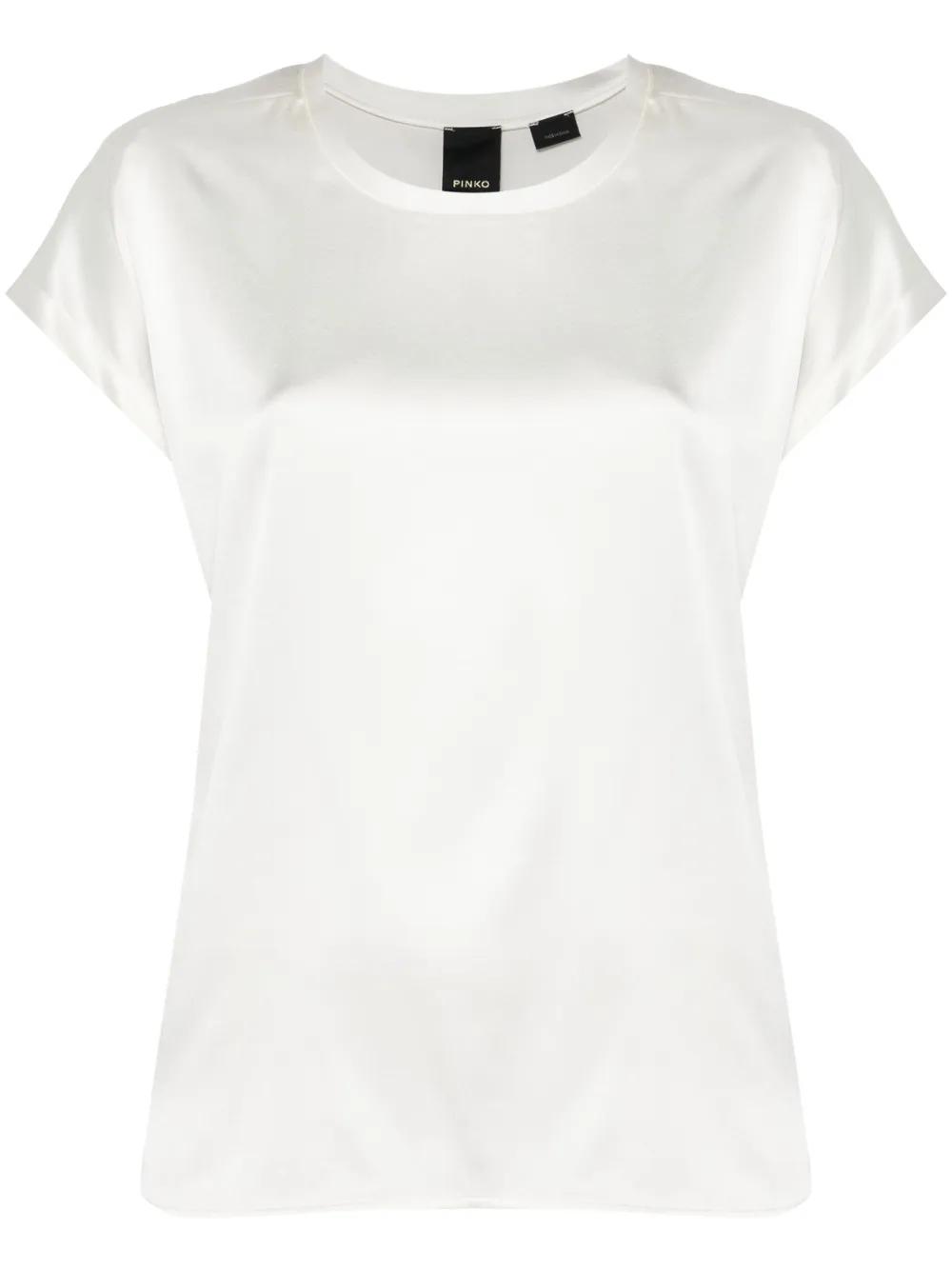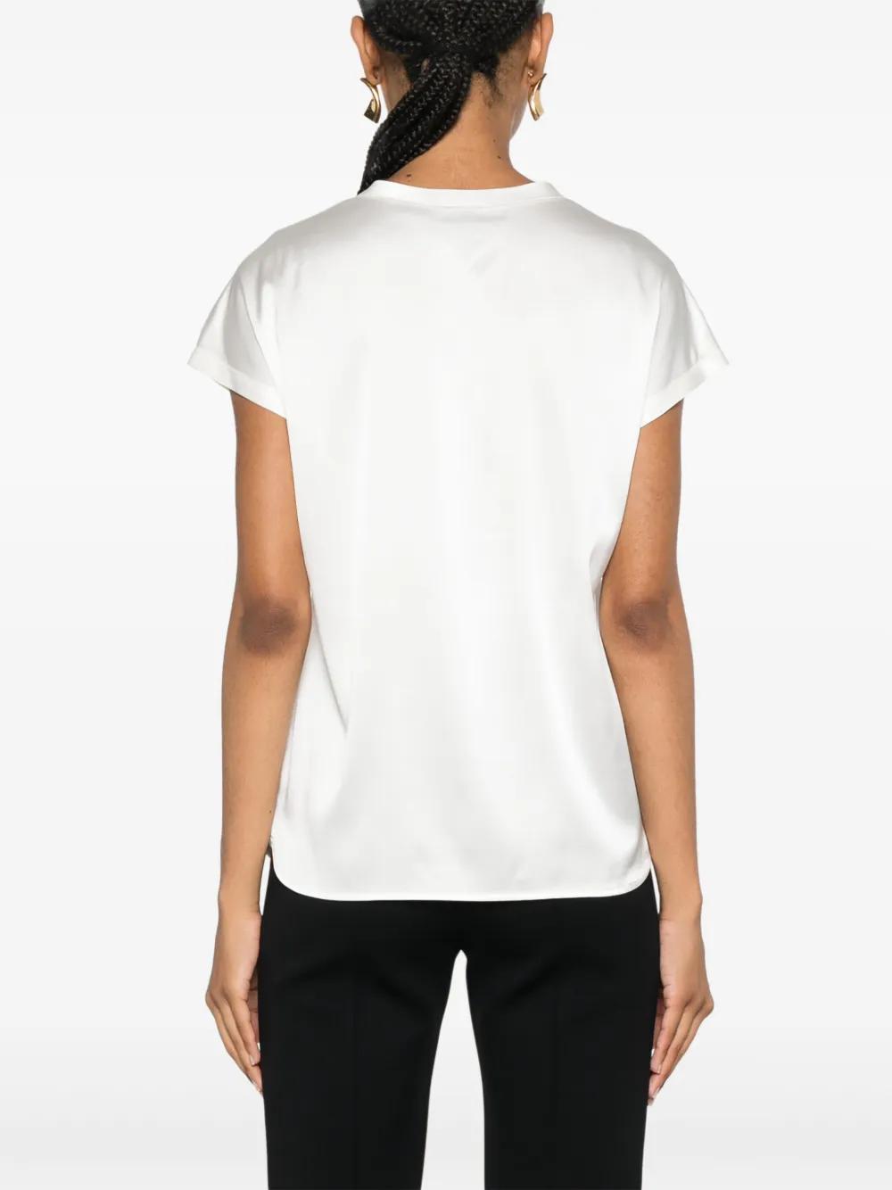 white silk blend satin finish crew neck short raglan sleeves curved hem