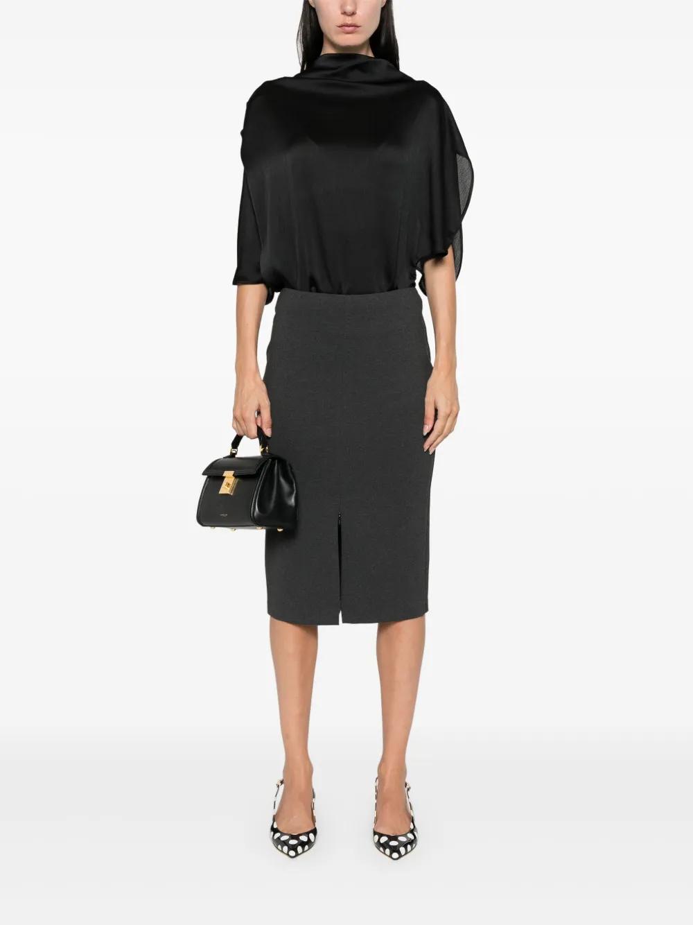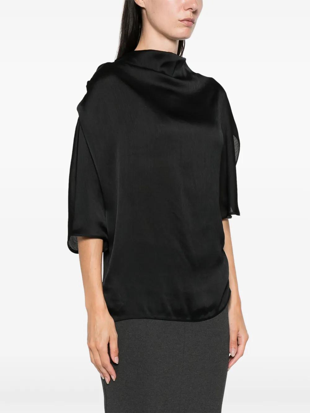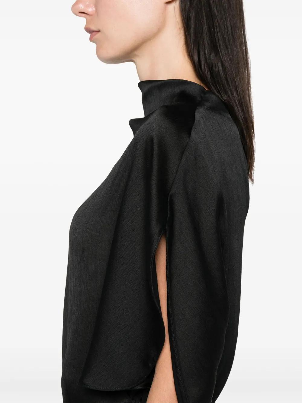 black crepe texture semi-sheer construction rear button fastening mock neck half-length sleeves ruched detailing keyhole detail to the rear asymmetric hem