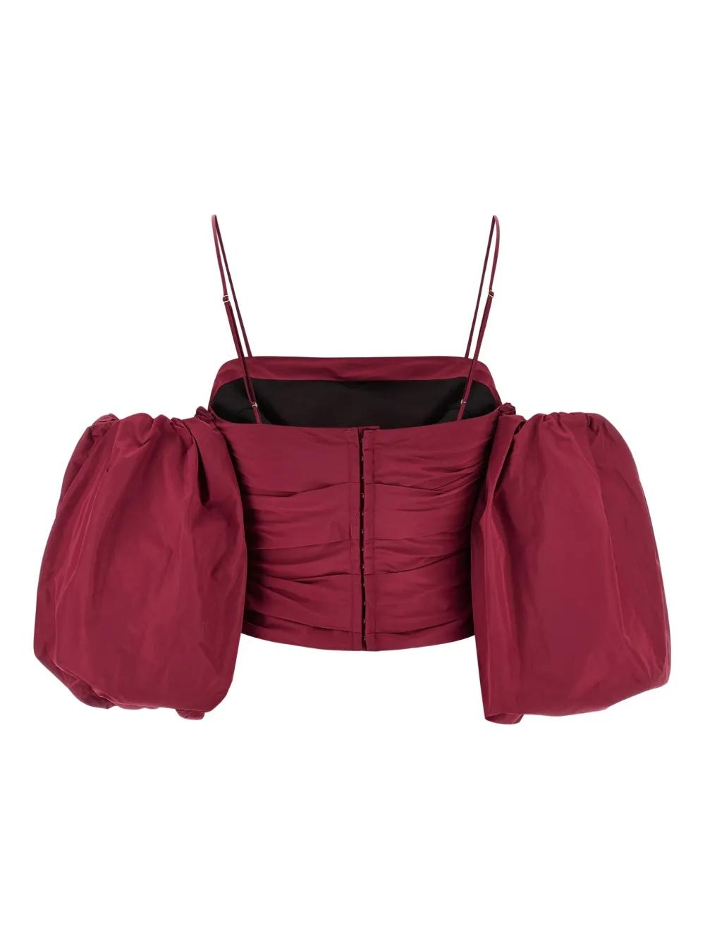 bordeaux red taffeta pleated hook closure thin adjustable straps removable balloon sleeves