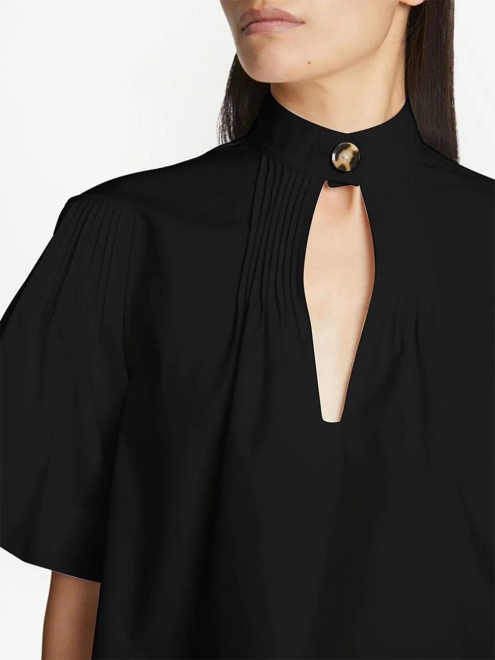 black cotton pintuck detailing front button fastening high neck short sleeves flared straight hem