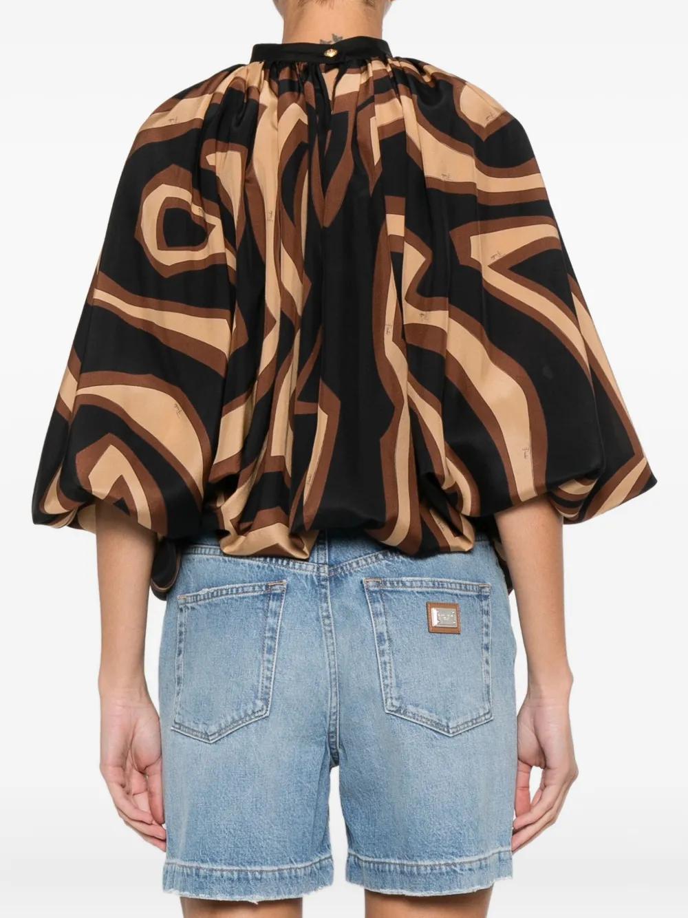brown abstract pattern gathered neckline button detailing long sleeves gathered hem