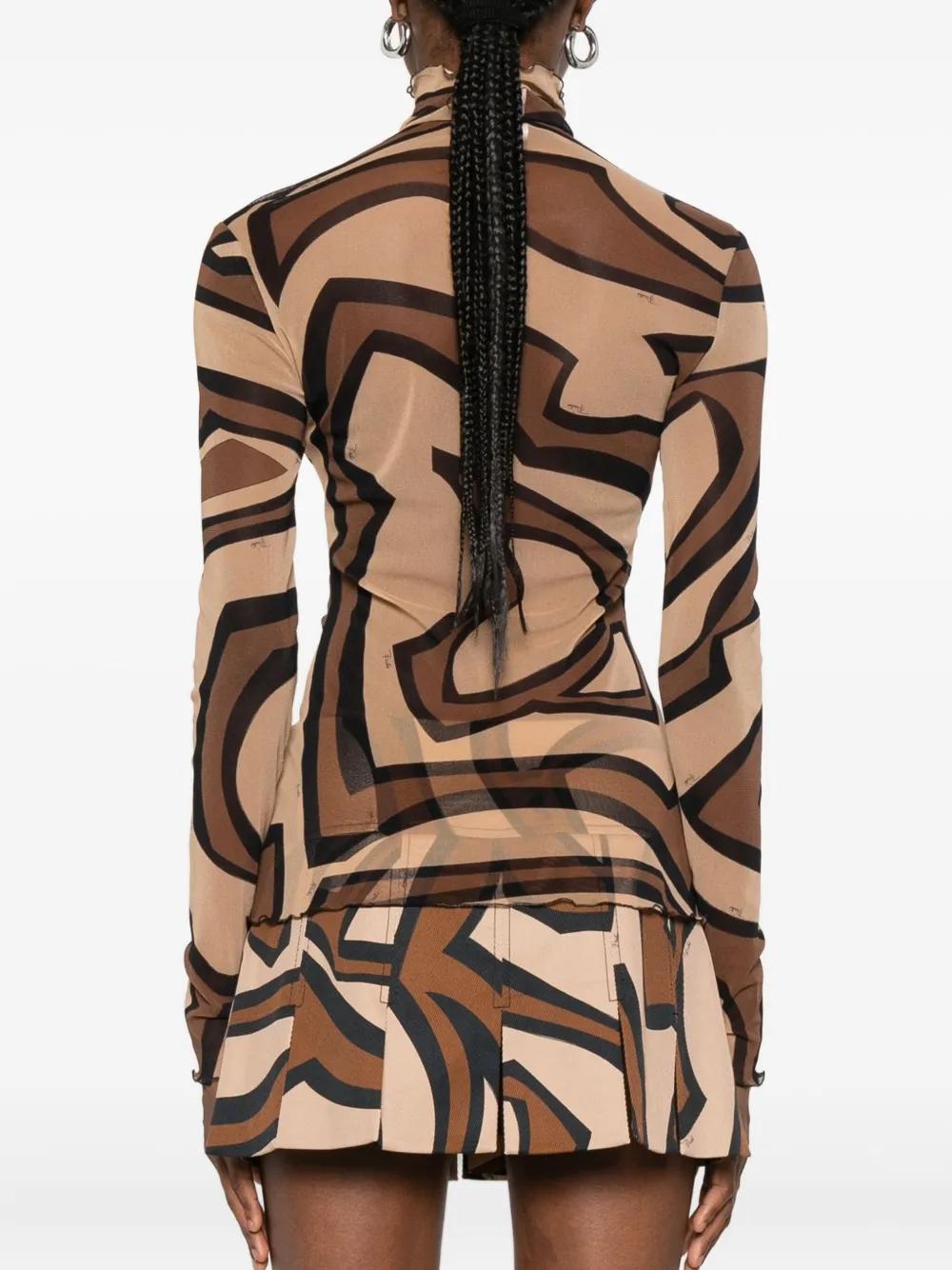 beige Labirinto print ruffled trim high neck long sleeves semi-sheer