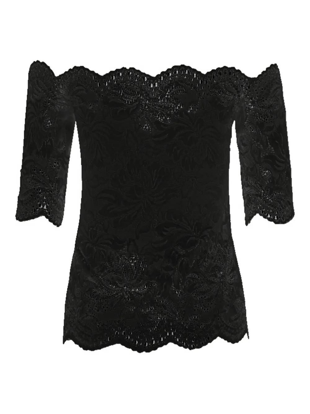 black off-shoulder neckline short sleeves scalloped hem floral lace pattern