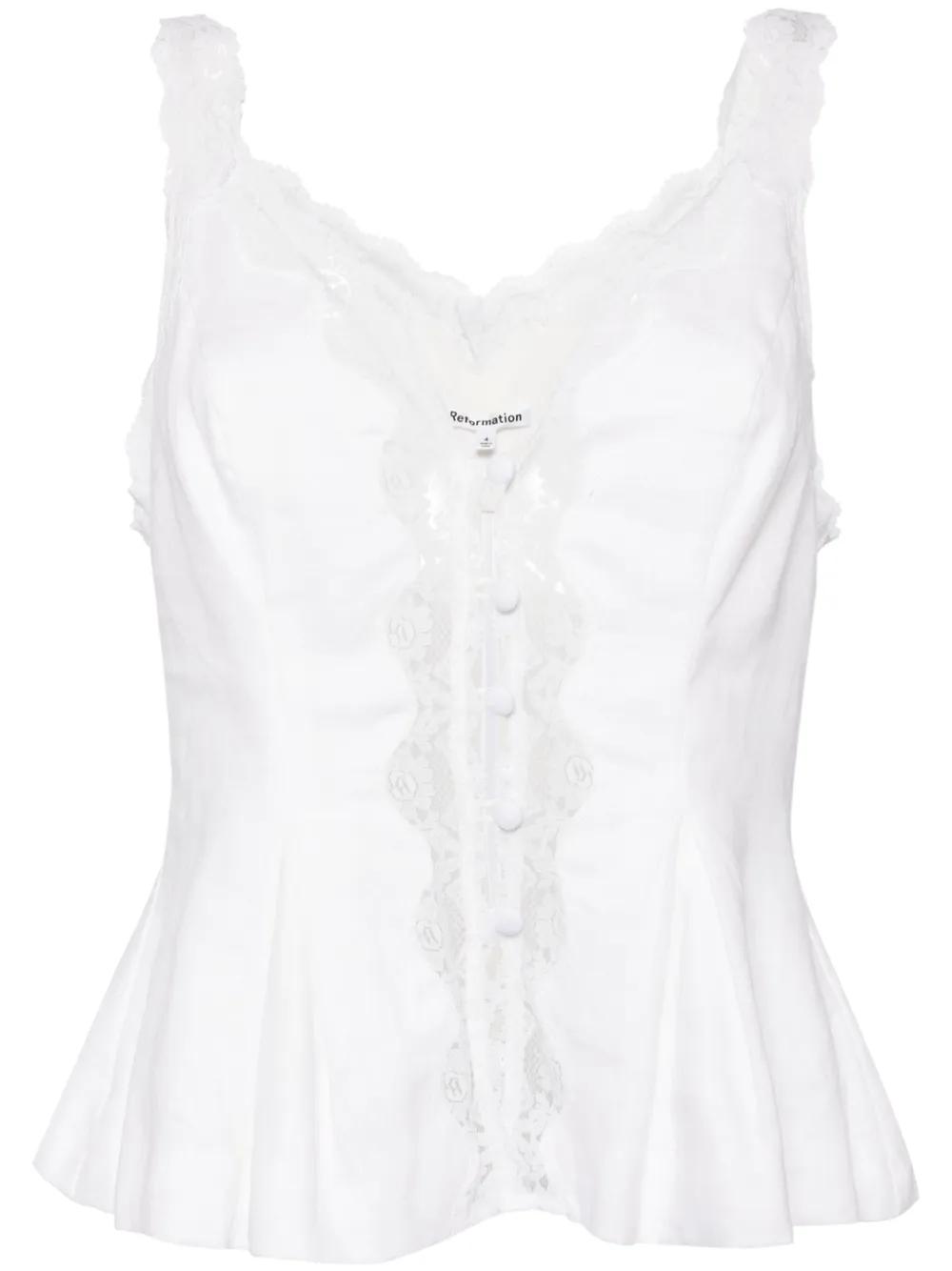 white linen concealed rear zip fastening lace trim self-tie fastening button fastening V-neck lined bodice
