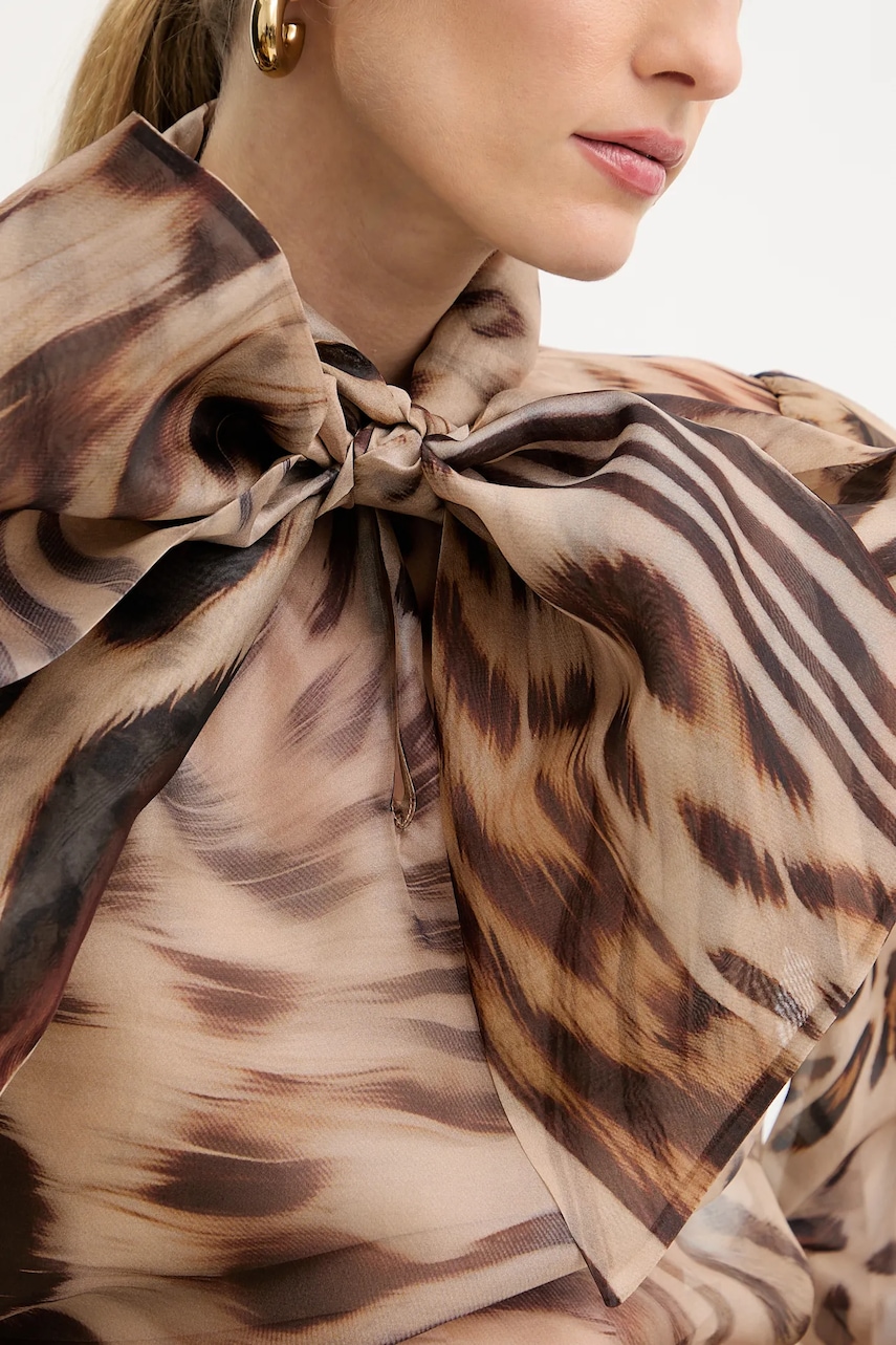 - Luźny krój zapewniający pełną swobodę ruchów. - Długie, bufiaste rękawy. - Ozdobne wiązanie przy dekolcie. - Rękawy wykończone wygodnym, elastycznym ściągaczem. - Dekolt zapinany na haftkę. - Model wykonany z tiulowego, transparentnego materiału. - Długość rękawa: 70 cm. - Długość: 59 cm. - Szerokość pod pachami: 50 cm. - Wymiary podane dla rozmiaru: S.