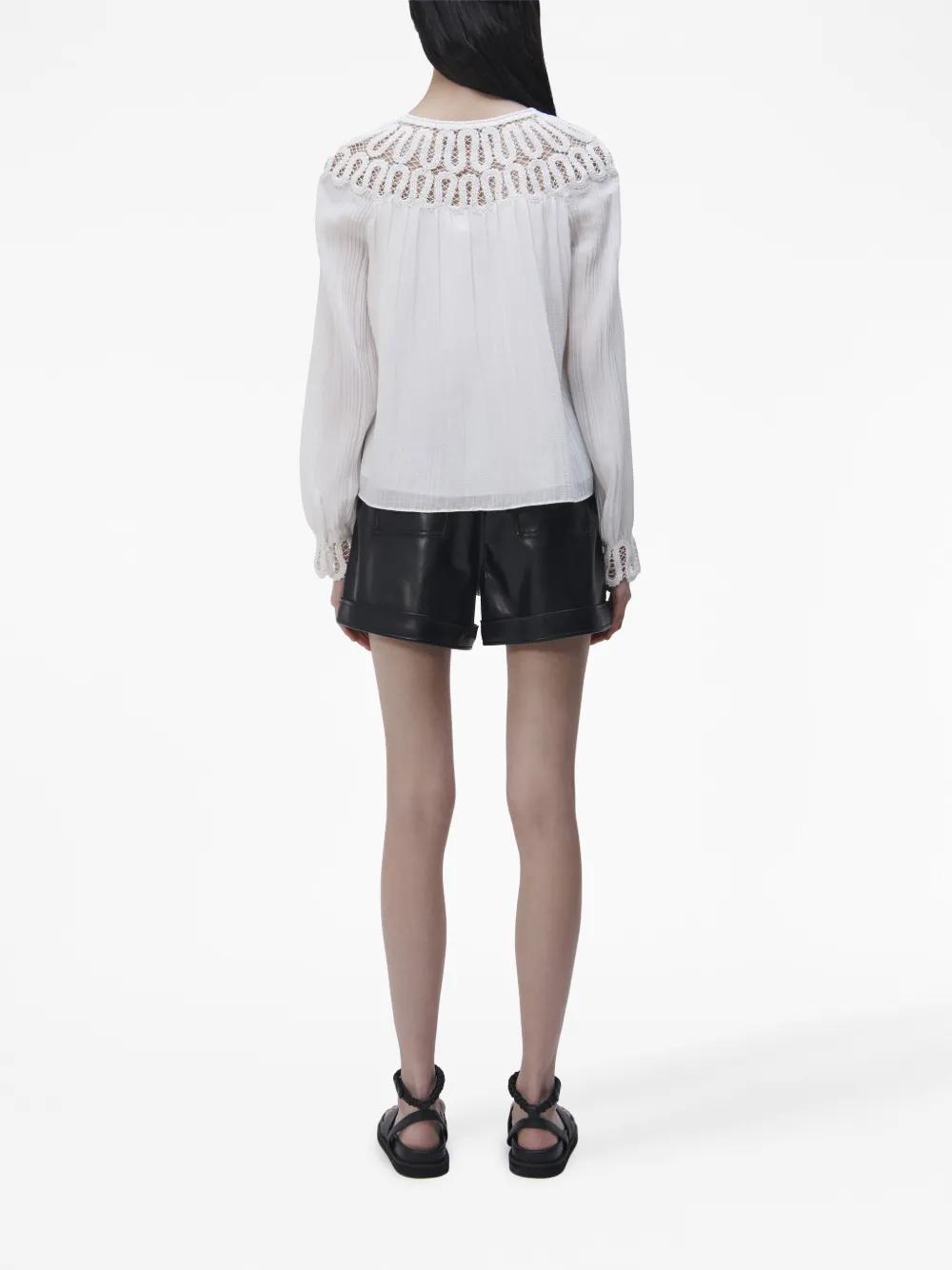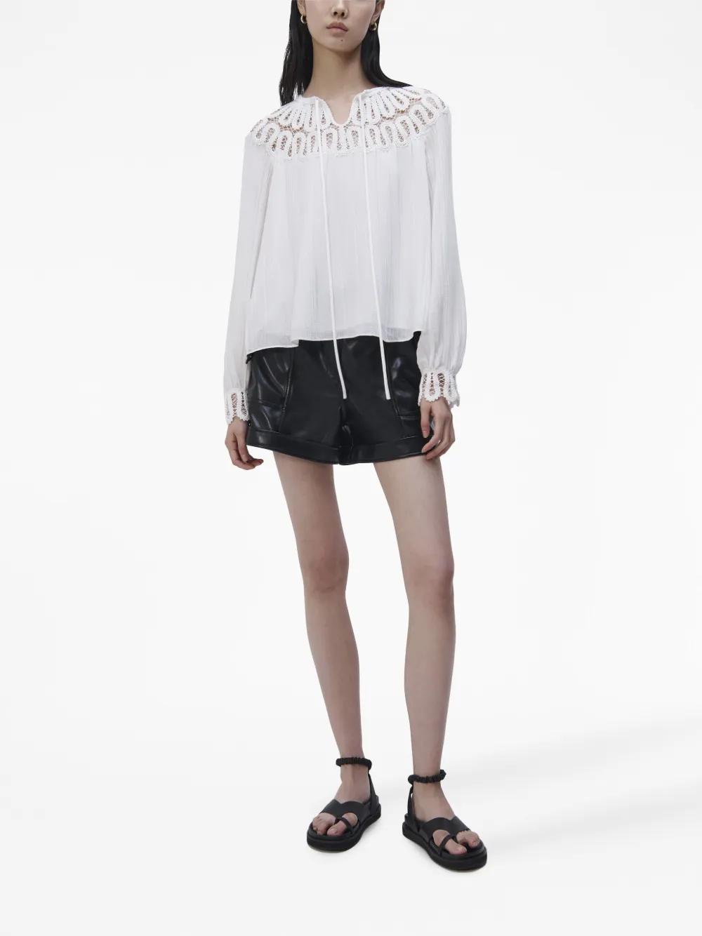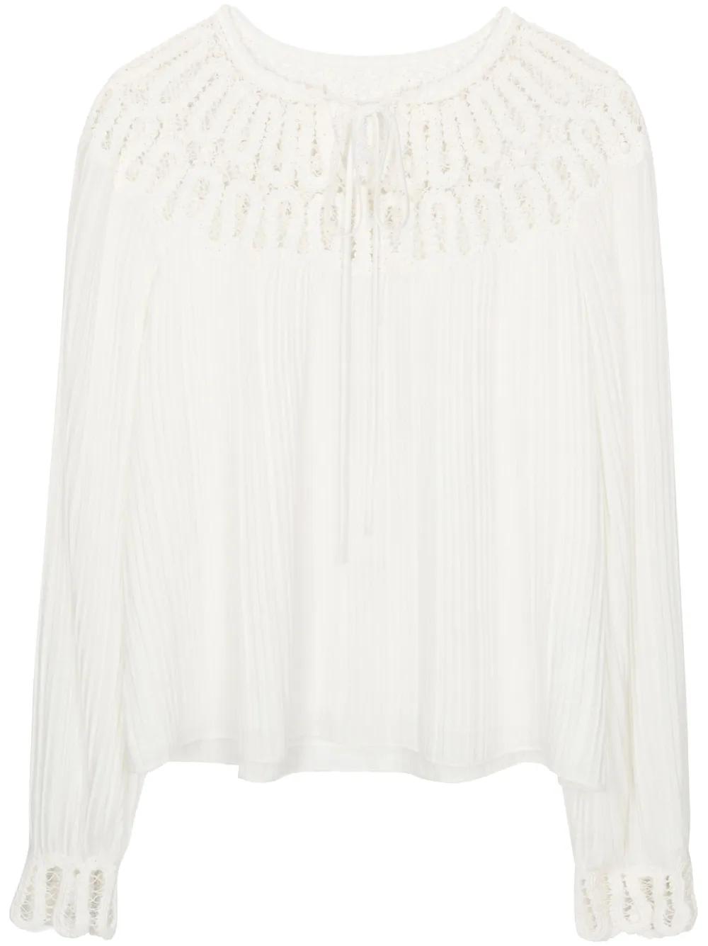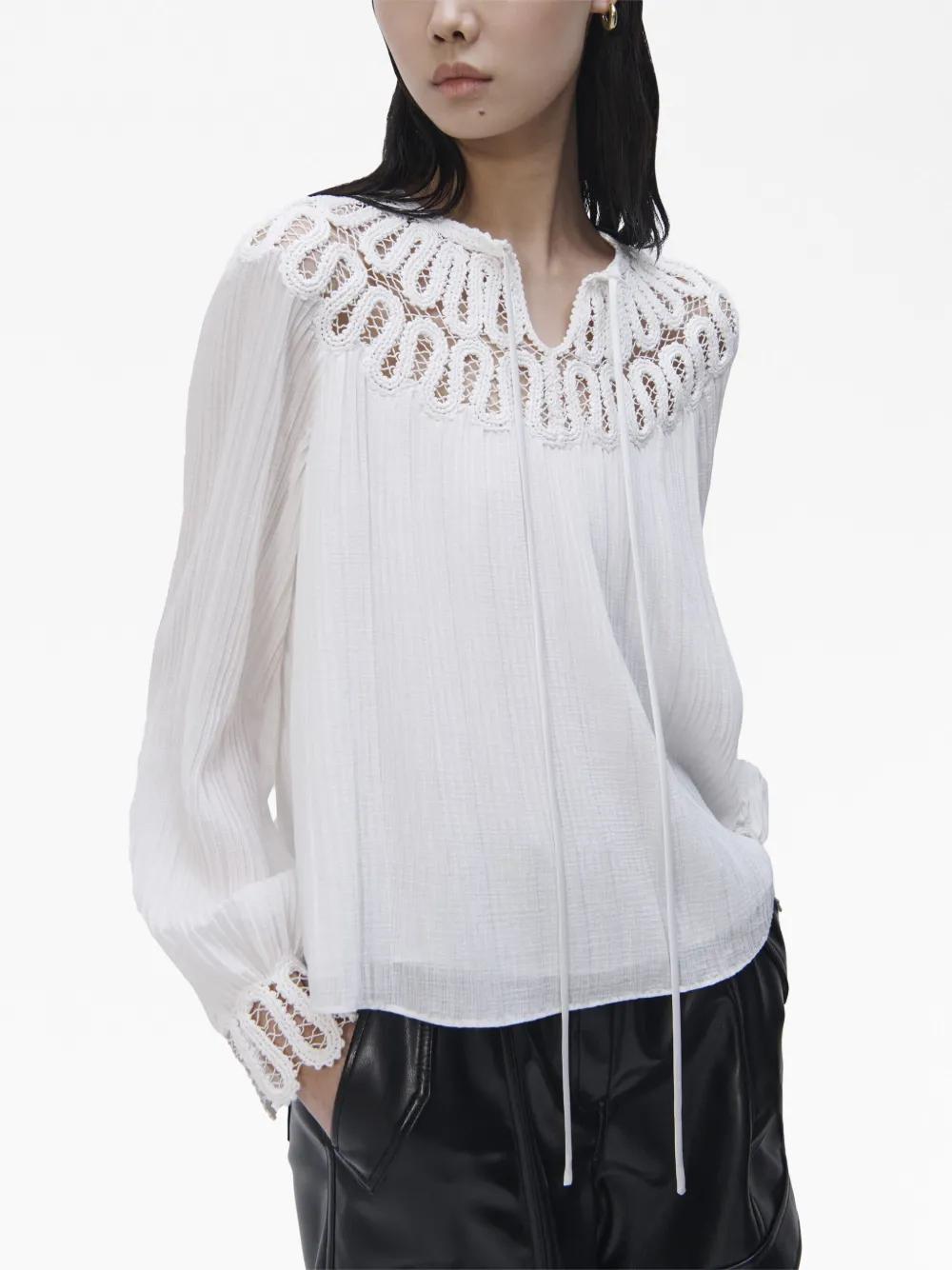 white guipure lace panelling double layer U-neck self-tie fastening long sleeves straight hem