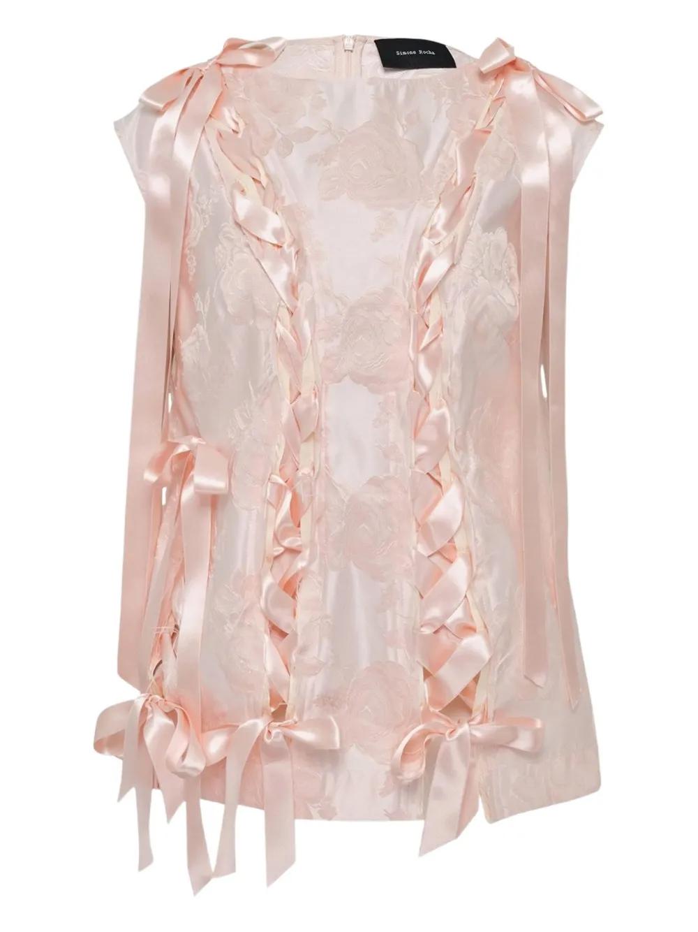 light pink ribbon detail brocade pattern sleeveless bow detail rear slit