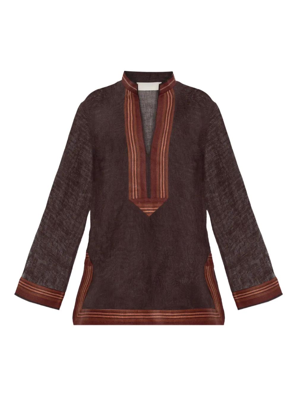 brown zebra pattern tie detail short sleeves V-neck adjustable tie fastening
