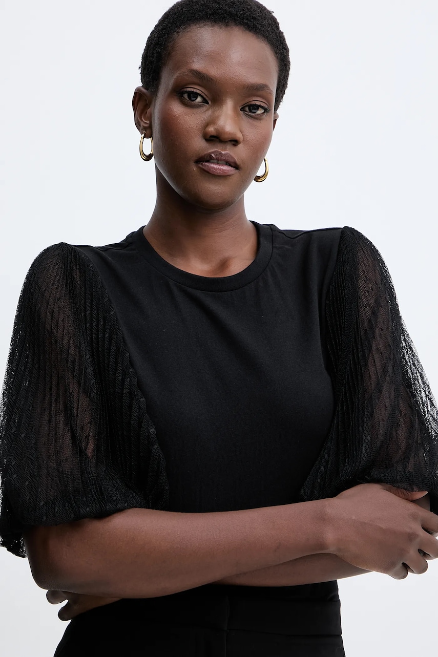 - Prosty, nie blokujący ruchów fason. - Klasyczny, okrągły dekolt. - Krótkie, bufiaste rękawy. - Rękawy wykończone wąskim, elastycznym ściągaczem. - Model z koronkowymi wstawkami. - Długość: 61 cm. - Szerokość pod pachami: 43 cm. - Wymiary podane dla rozmiaru: S.