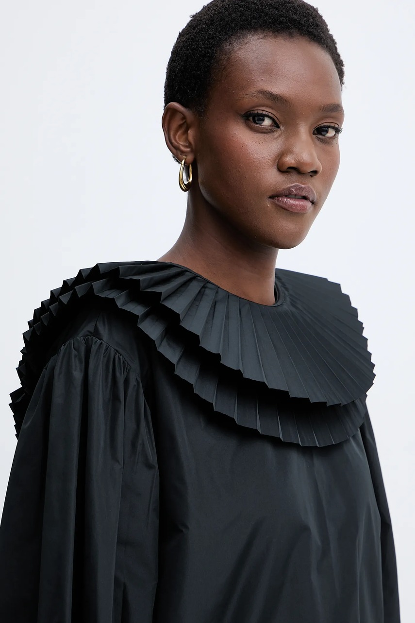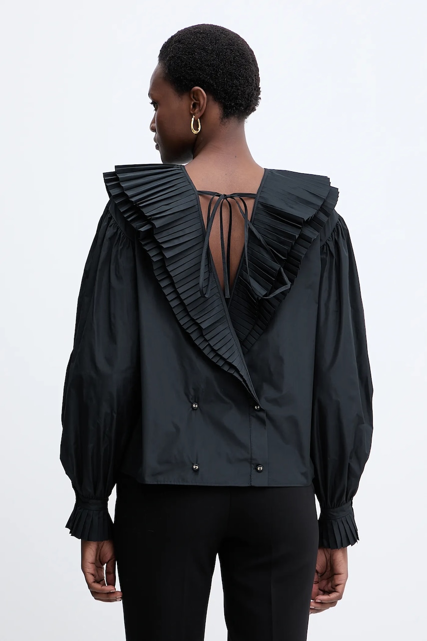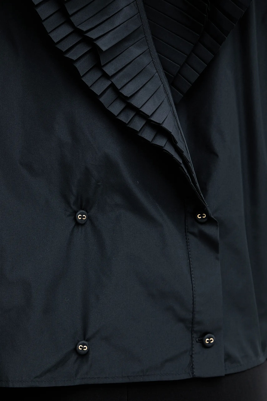 - Luźny krój zapewniający pełną swobodę ruchów. - Długie, bufiaste rękawy. - Klasyczny, okrągły dekolt. - Z tyłu dwurzędowe zapięcie na guziki. - Model z wiązaniem umożliwiającym regulację. - Model z ozdobnymi falbanami. - Długość rękawa(mierzona od dekoltu): 75 cm. - Długość: 56 cm. - Szerokość pod pachami: 51 cm. - Wymiary podane dla rozmiaru: 36.
