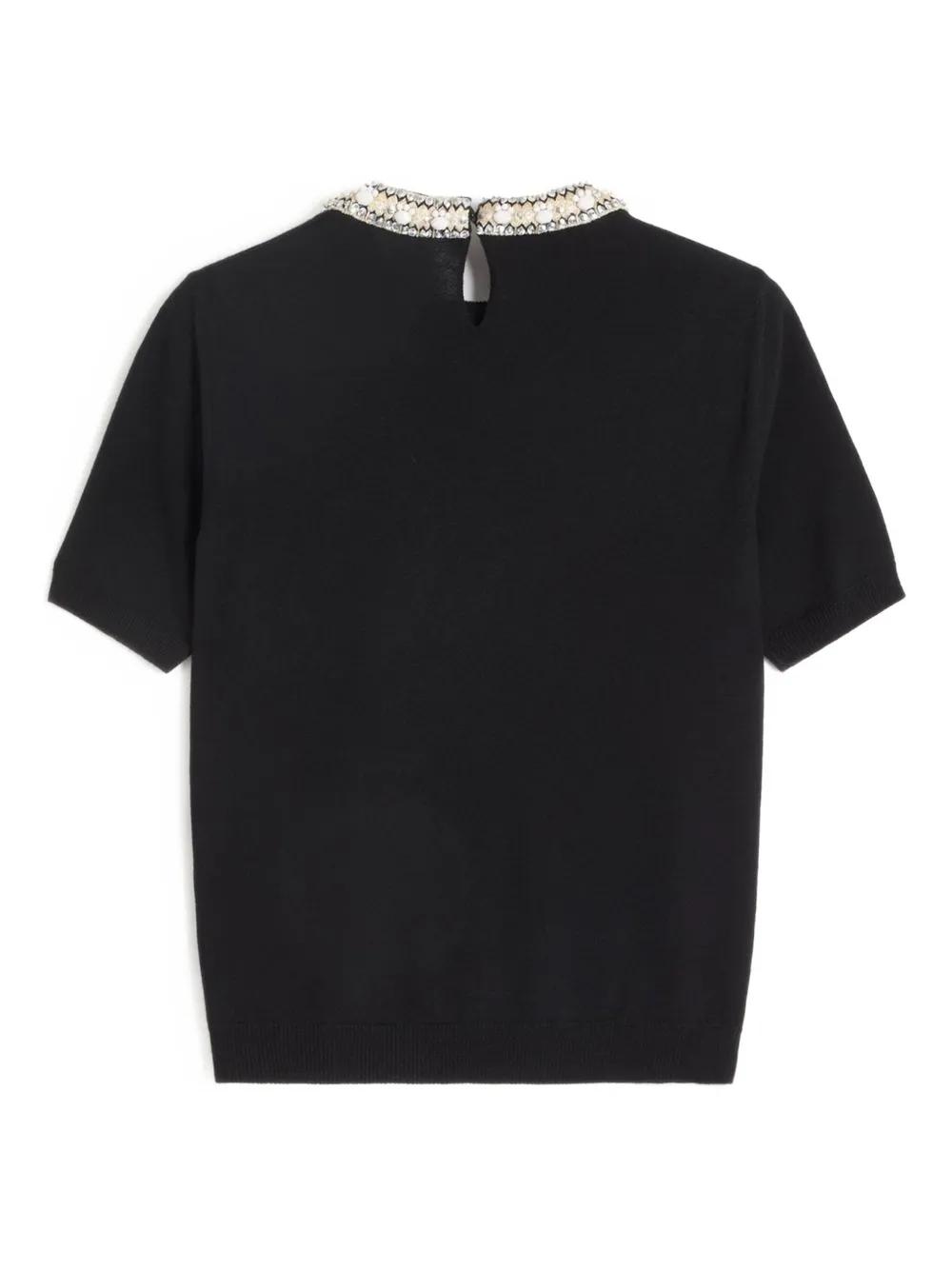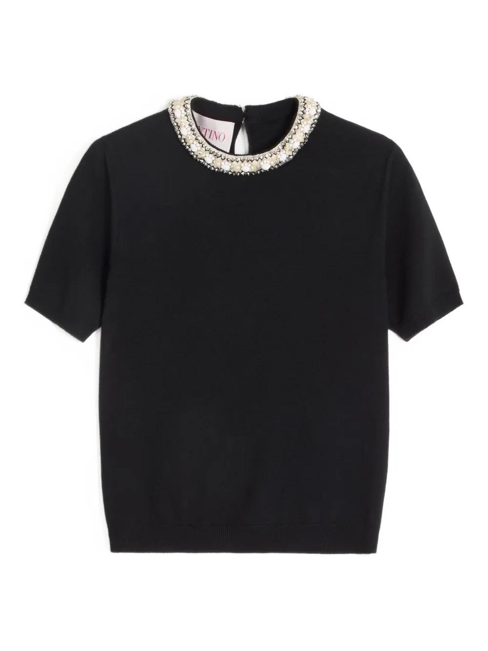 black virgin wool rear button fastening crystal embellishment at the neck short sleeves