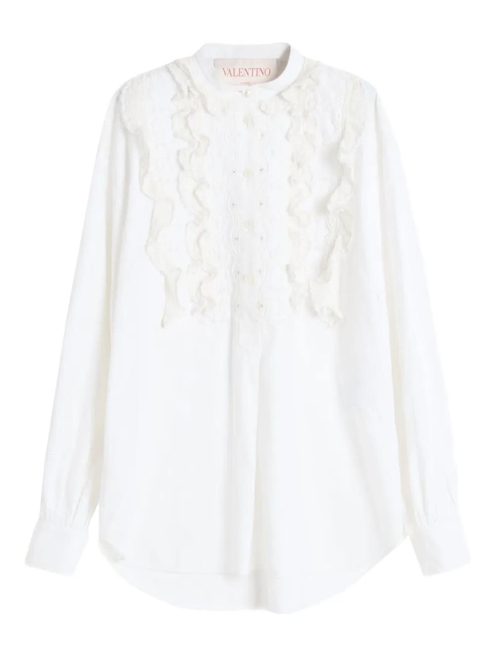 white button fastening frilled detailing long sleeves buttoned cuffs curved hem