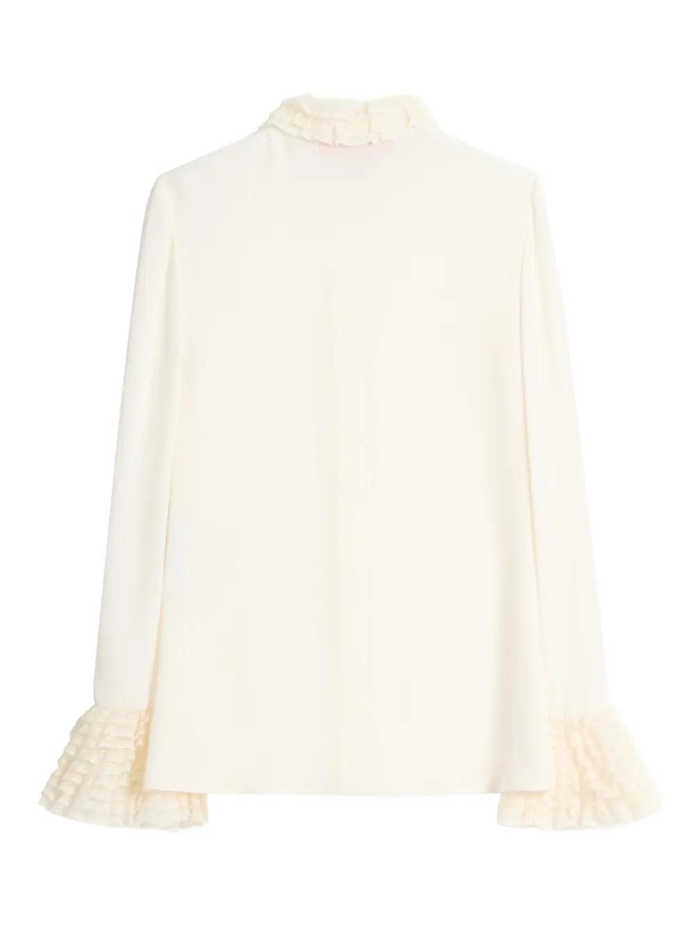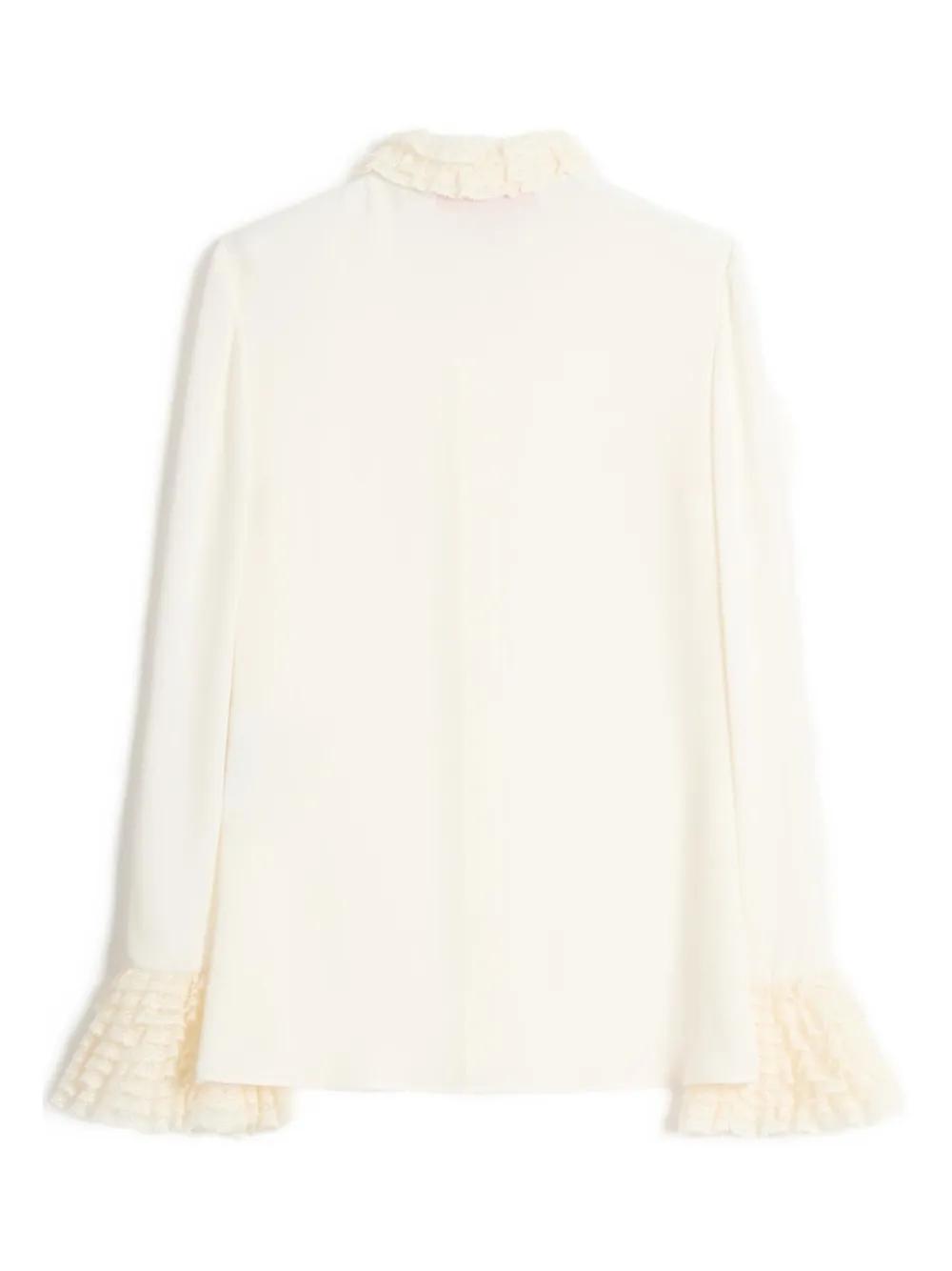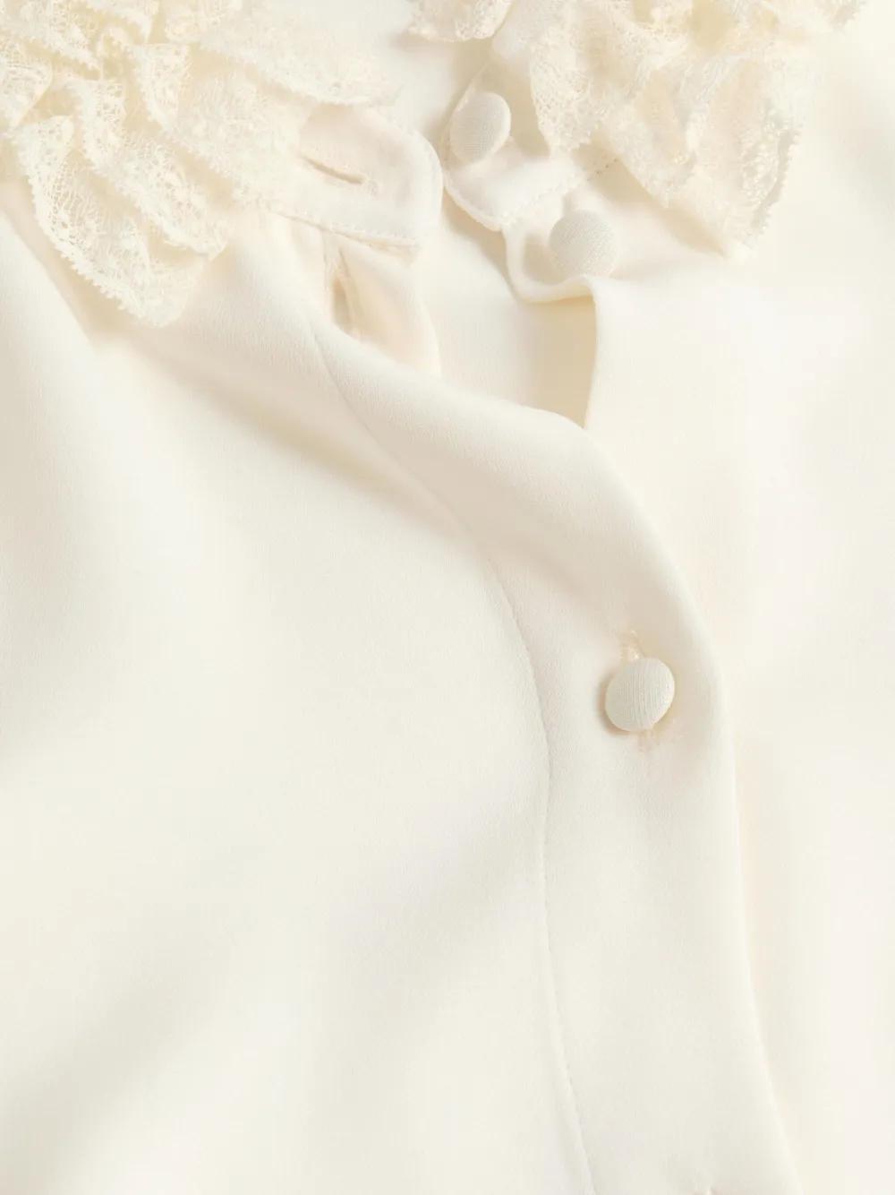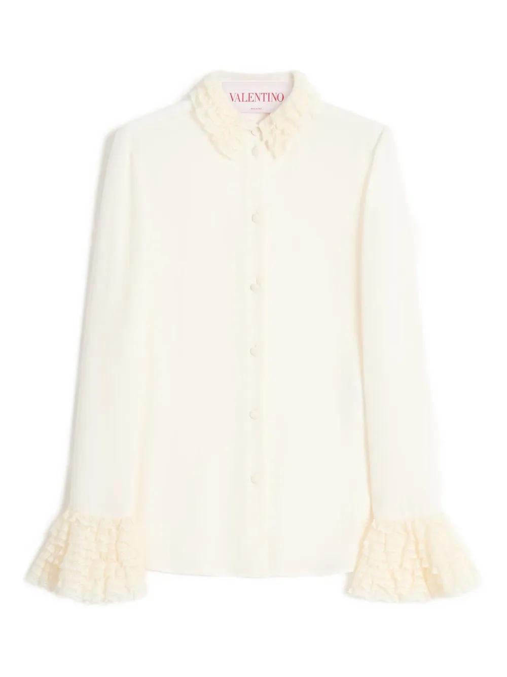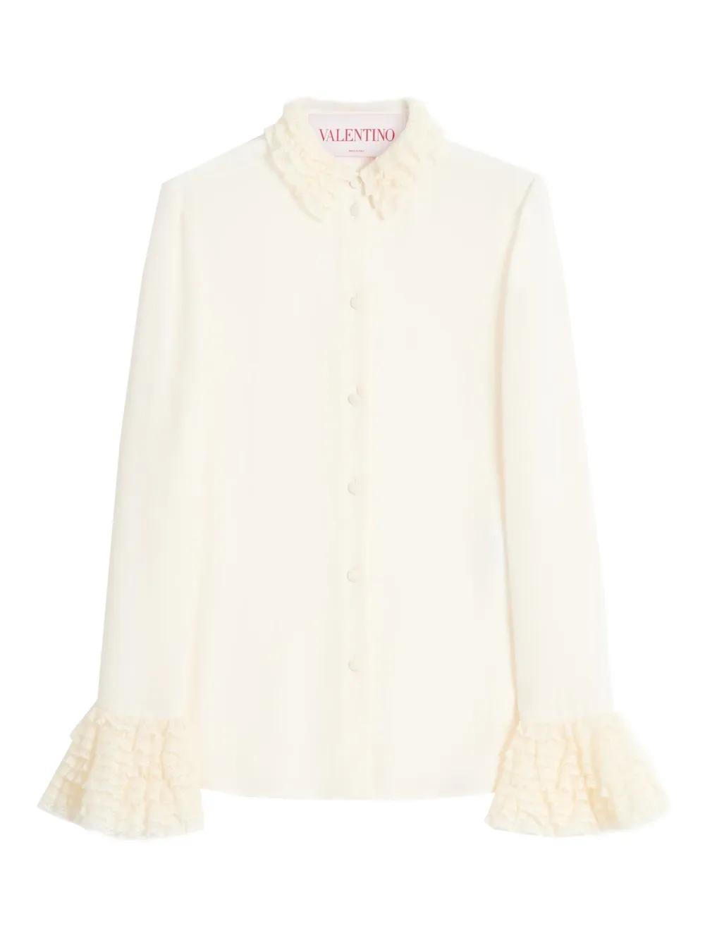 white silk crepe texture front button fastening fabric-covered buttons ruffled detailing straight hem