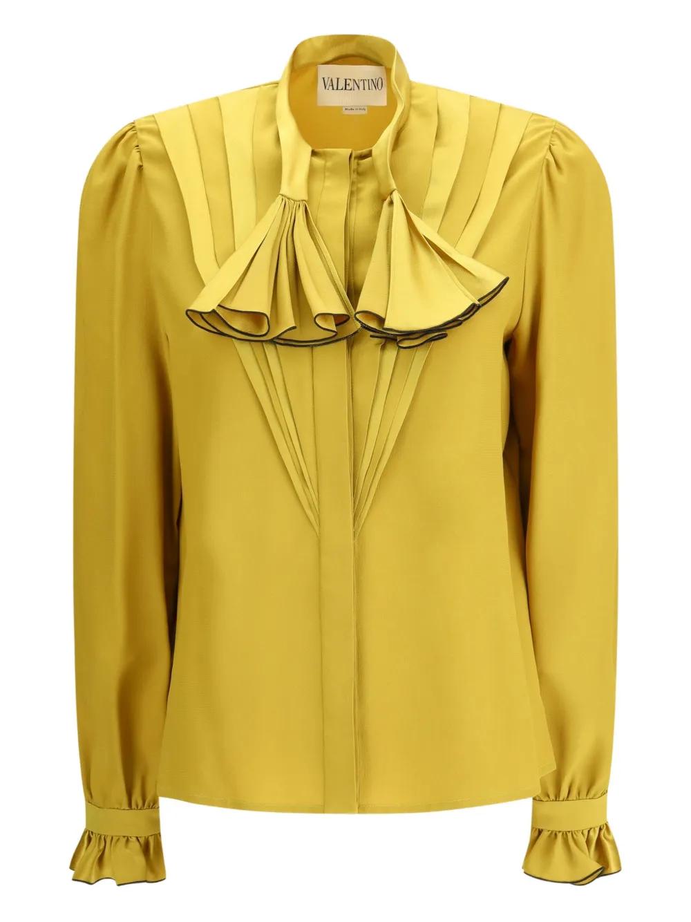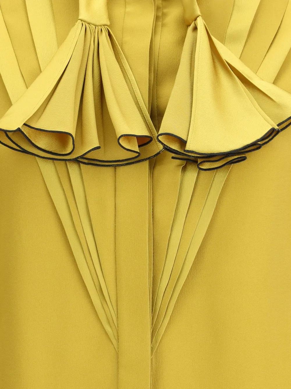 yellow ruffled trim buttoned cuffs long sleeves pleated detail