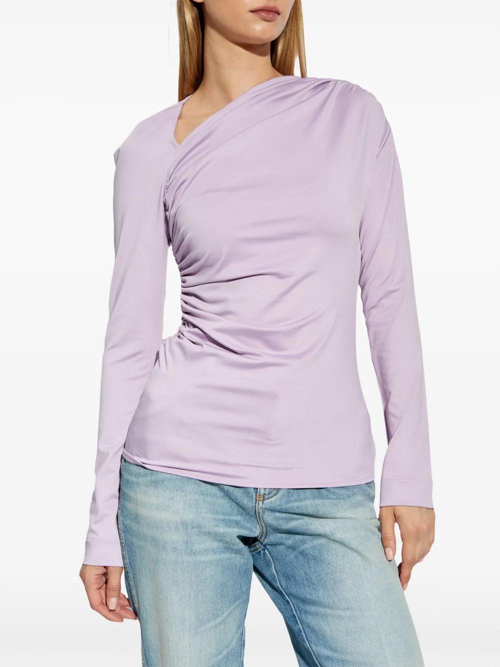 lilac purple asymmetric neck ruched detailing long sleeves straight hem slip-on style