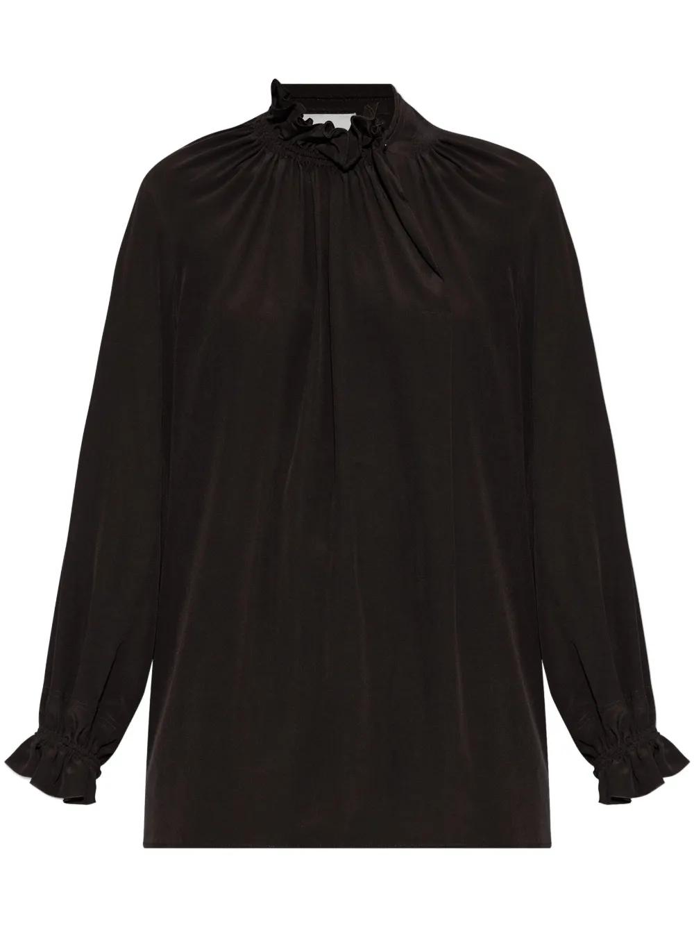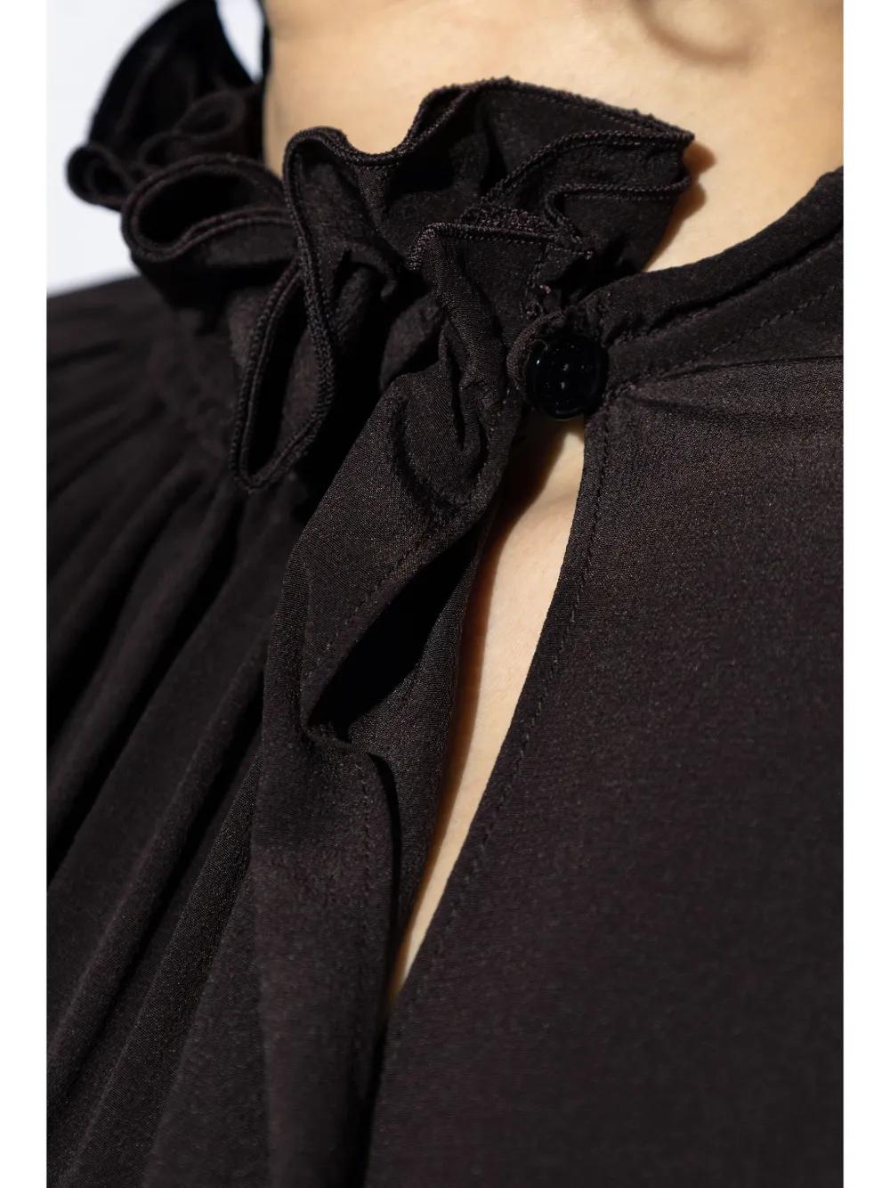 mahogany silk satin finish draped design ruffle collar balloon sleeves front button fastening