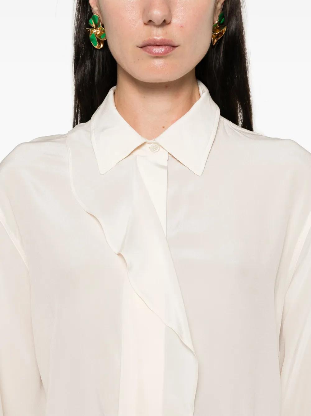 ivory white silk classic collar long sleeves with buttoned cuffs asymmetric ruffled detailing curved hem concealed front button fastening