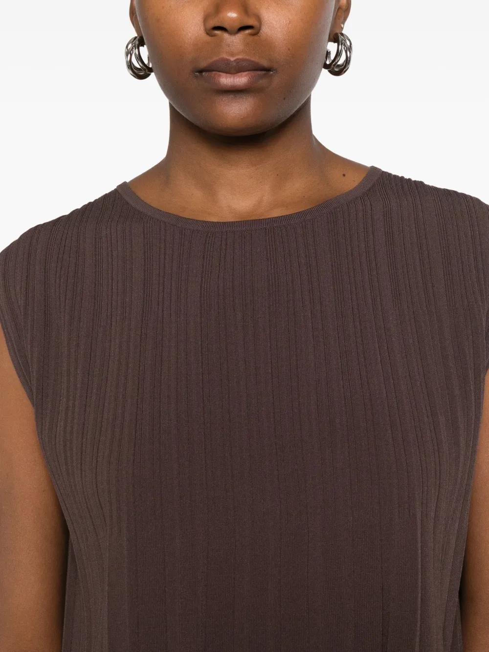 brown ribbed texture sleeveless design round neck pleated detailing