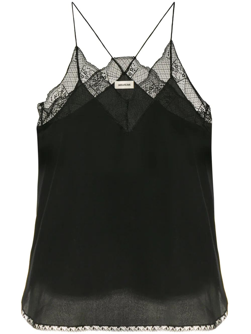 Black silk lace-detail camisole top from Zadig & Voltaire featuring spaghetti straps, a lace detail and a slim fit.