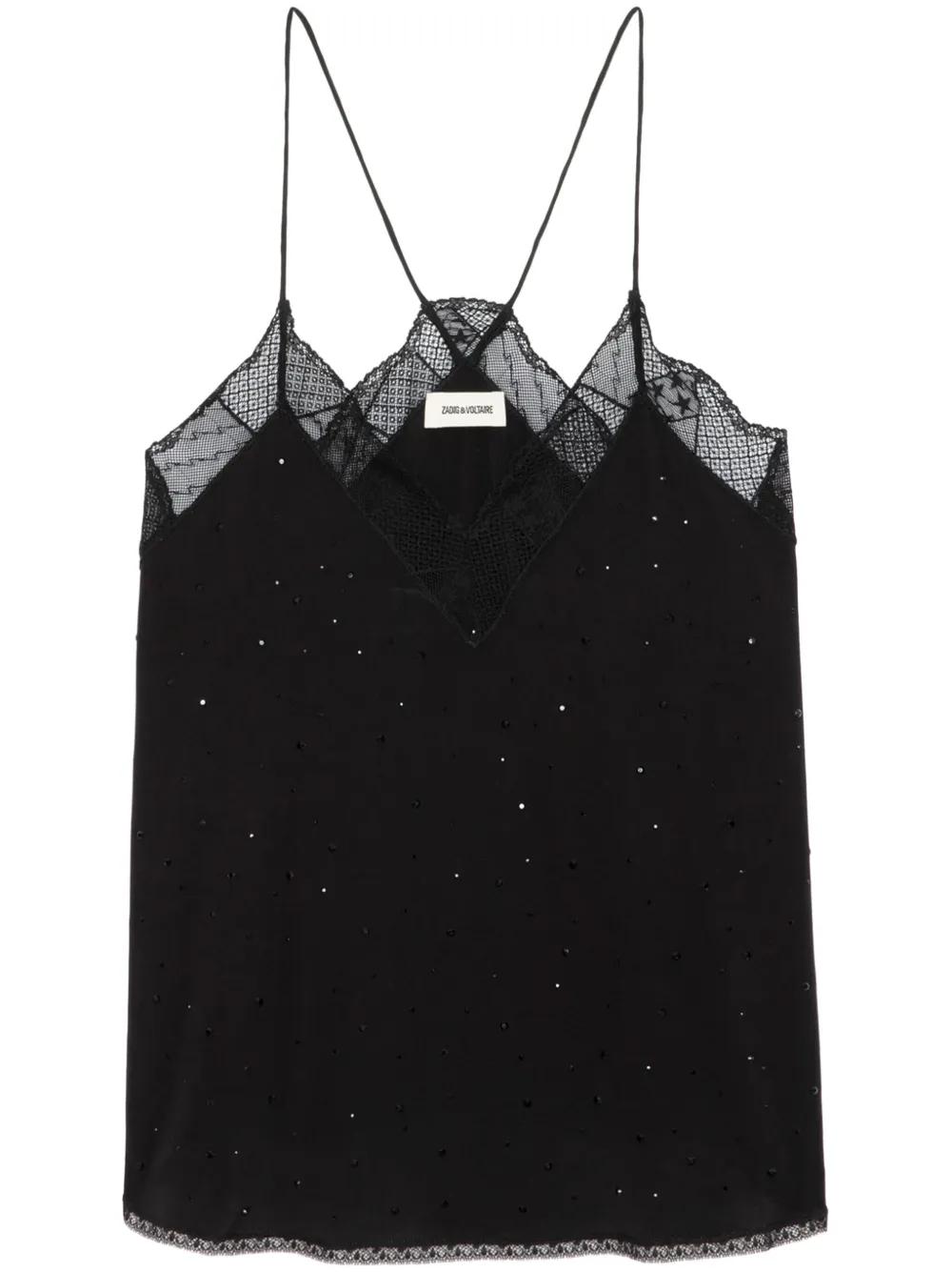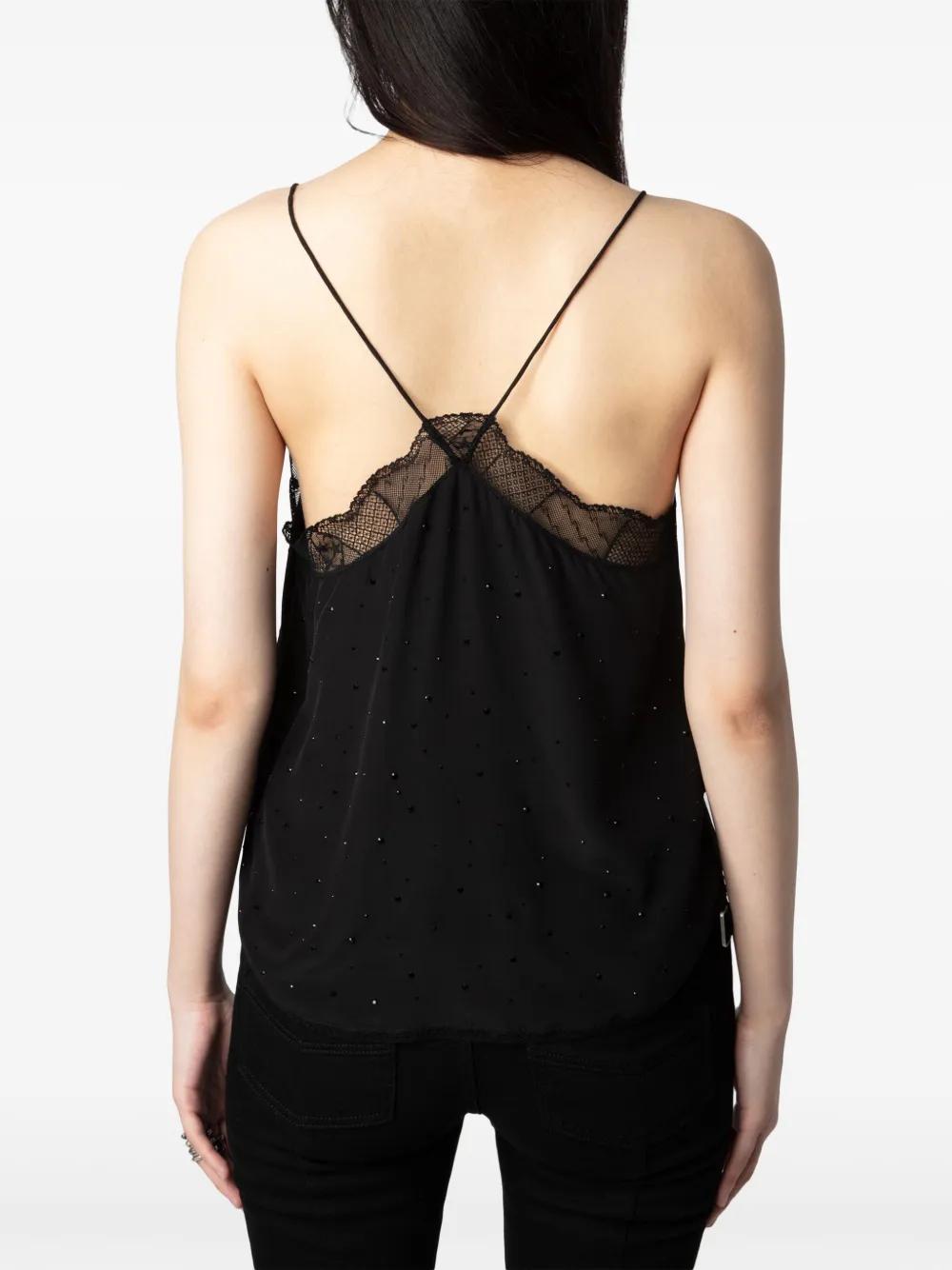 black silk slip-on style rhinestone embellishment lace trim V-neck thin shoulder straps straight hem
