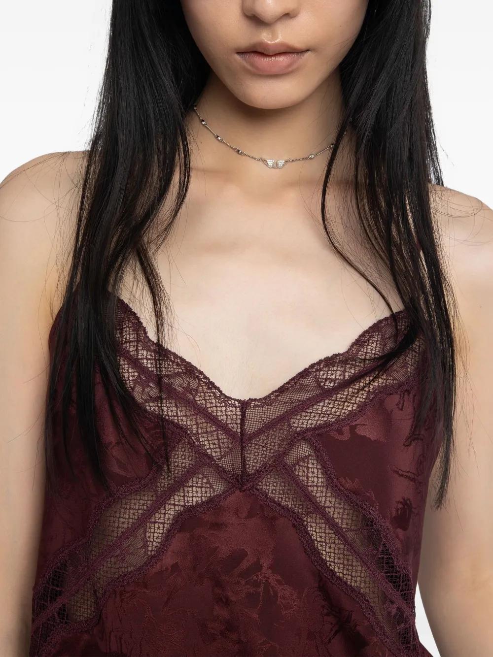burgundy horse motif lace trim spaghetti straps V-neck