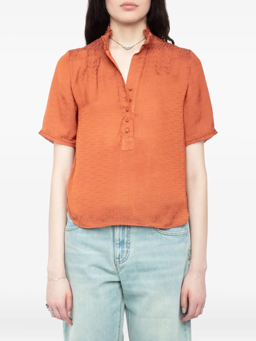 geranium orange short front button fastening short sleeves ruffle collar curved hem