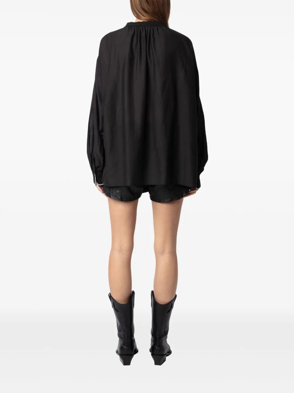 Black satin Tink tunic blouse from Zadig & Voltaire featuring a open mandarin collar, long sleeves and fitted cuffs.