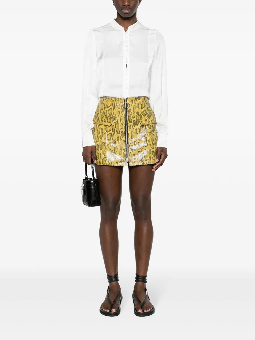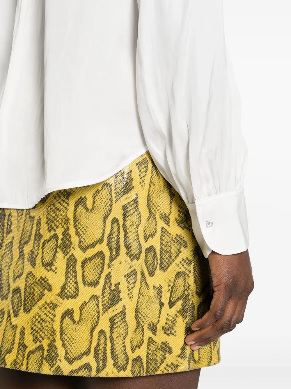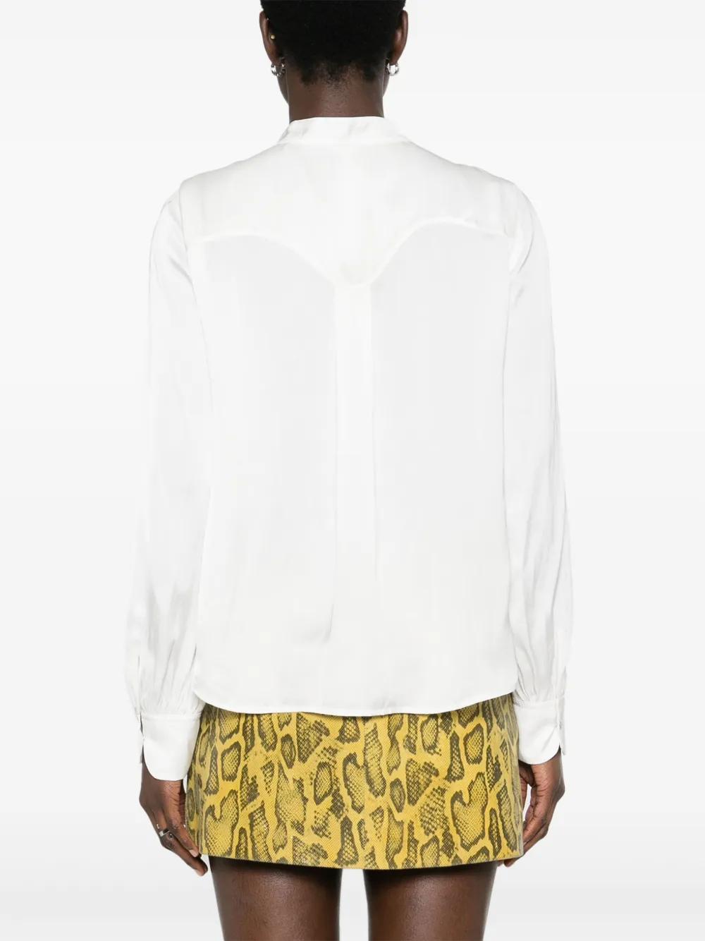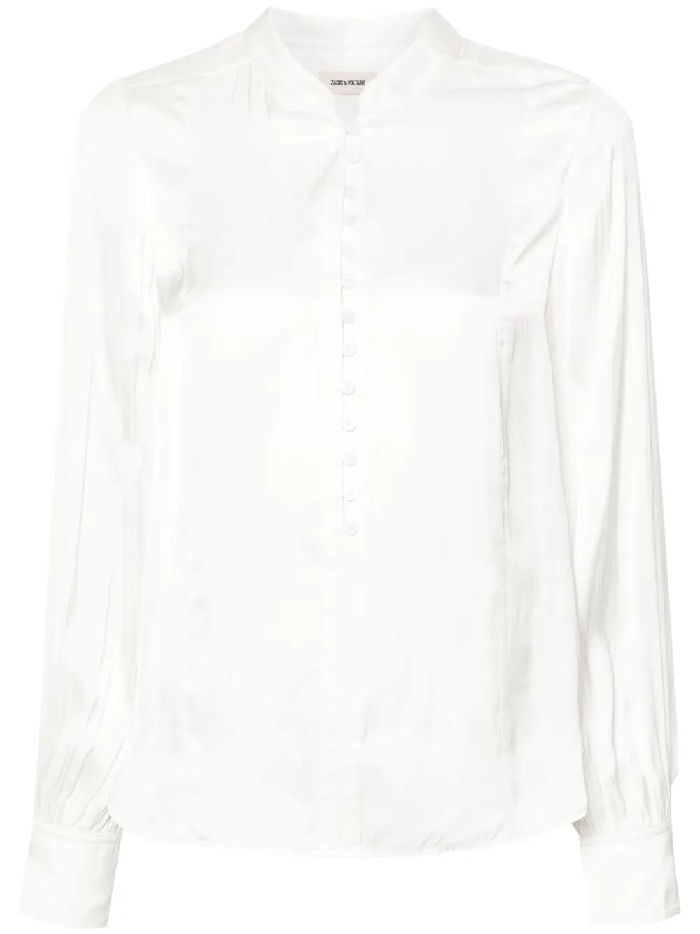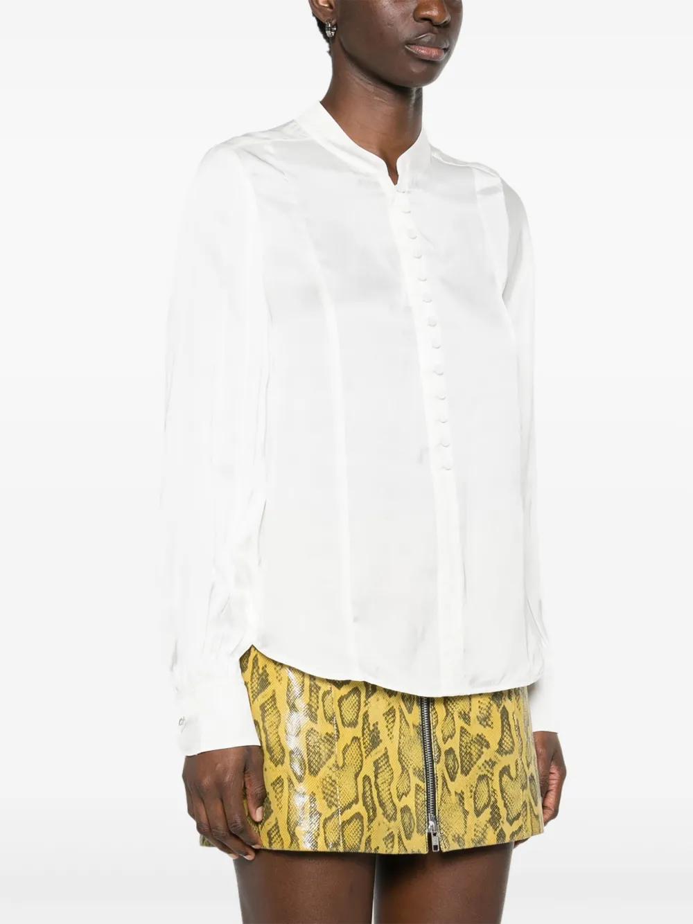 white satin finish dart detailing box-pleat detail pleat detailing band collar front button fastening long sleeves buttoned cuffs rhinestone-embellished buttoned cuffs curved hem