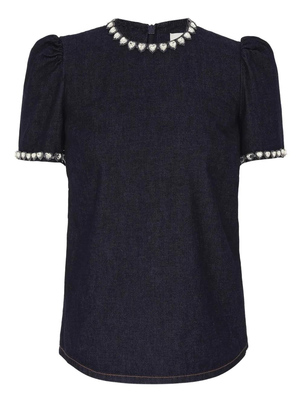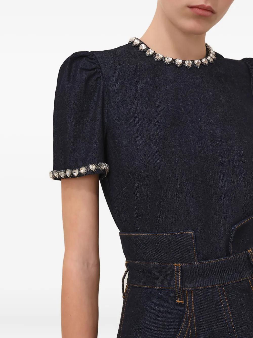 dark blue embellished neckline short puff sleeves zip fastening at the back