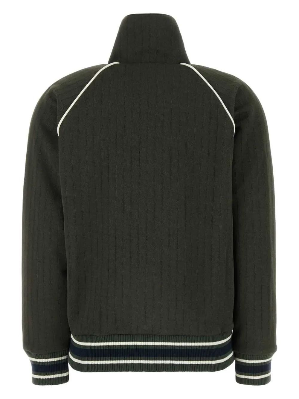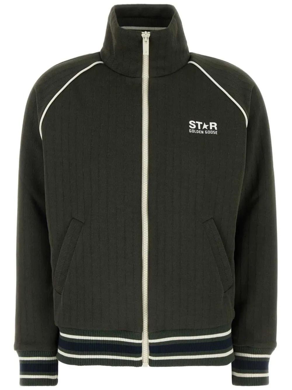 dark green front zip fastening logo print at the chest high neck two side slit pockets long sleeves straight hem