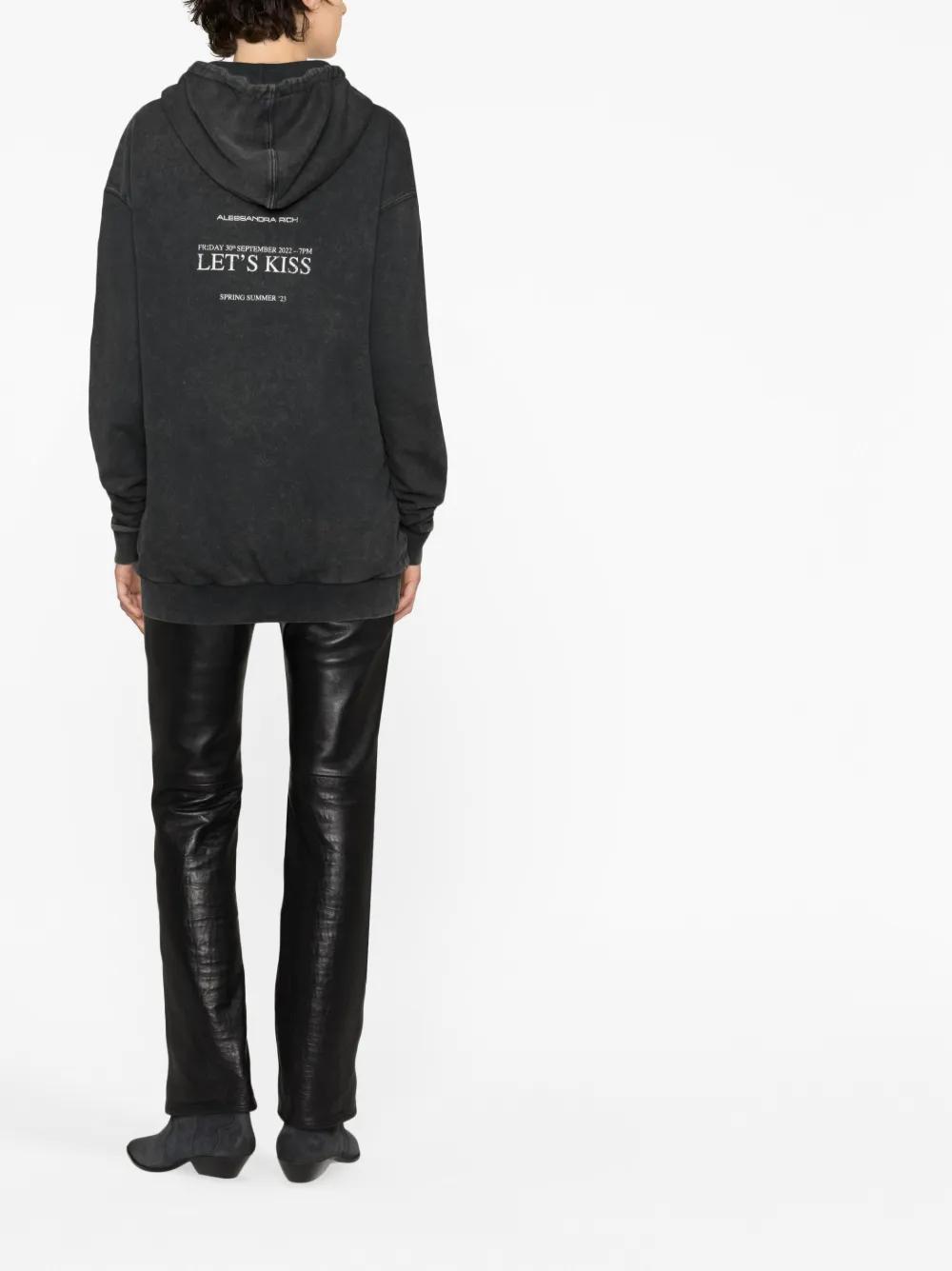 black cotton drawstring hood logo print to the front rhinestone embellishment drop shoulder straight hem