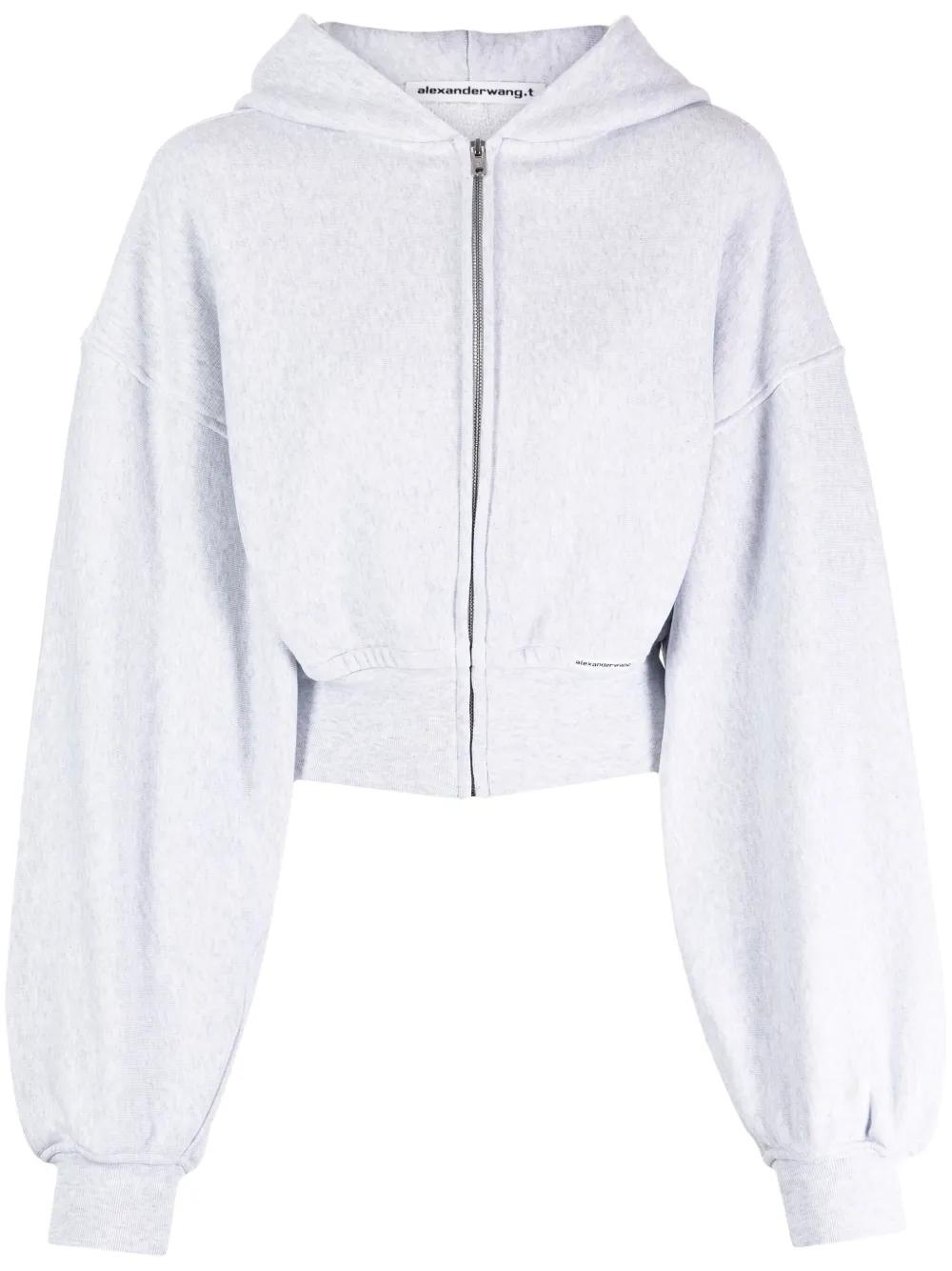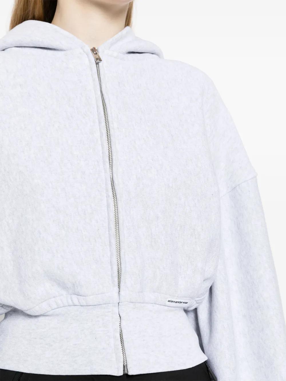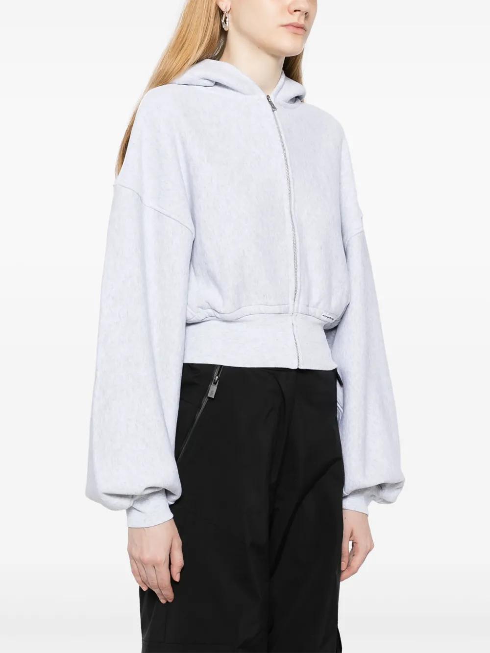 light grey stretch-cotton jersey texture mélange effect logo patch to the front classic hood front zip fastening drop shoulder long wide sleeves ribbed cuffs and hem fitted waistline cropped
