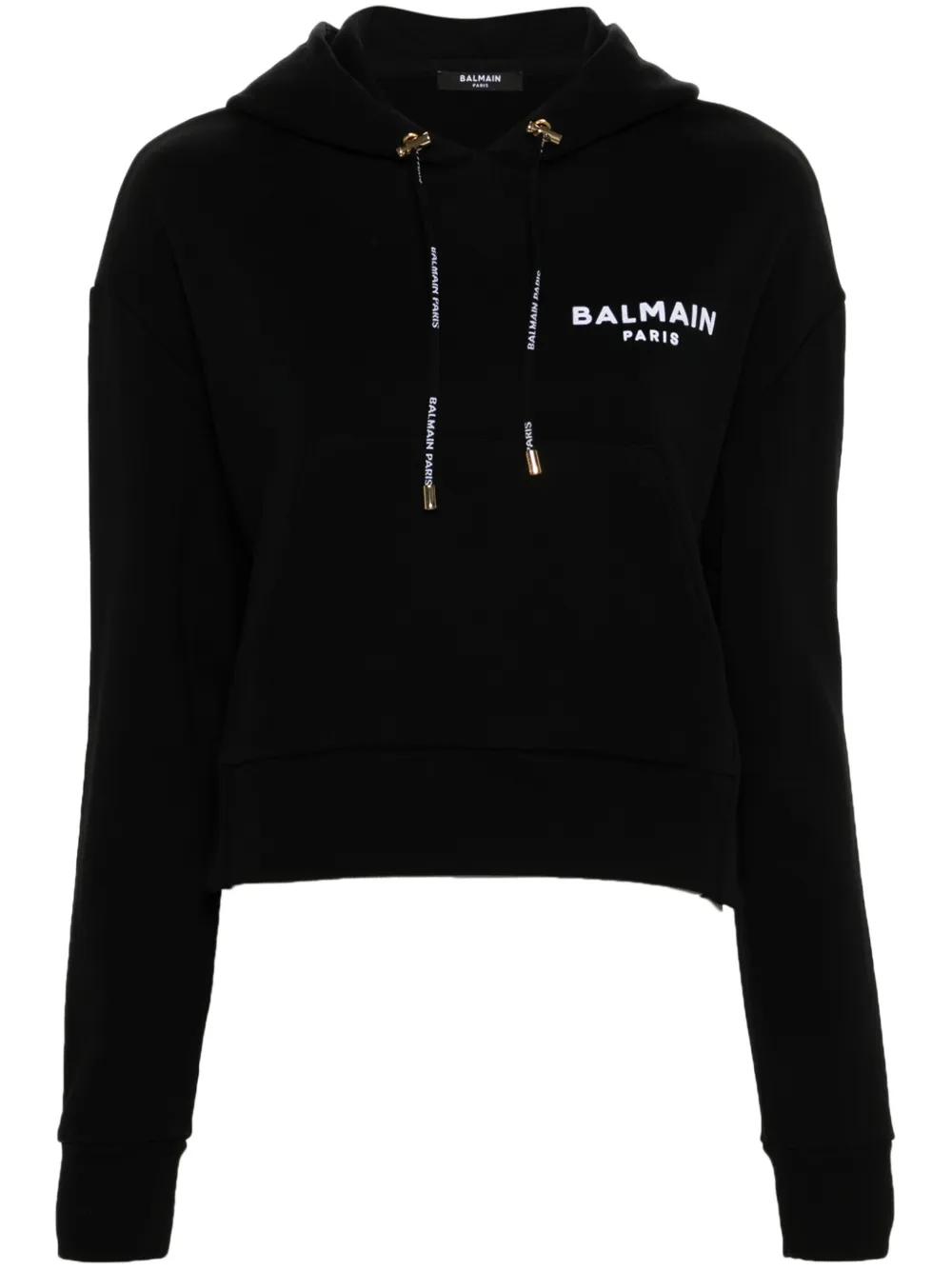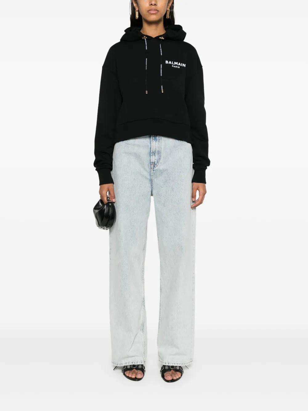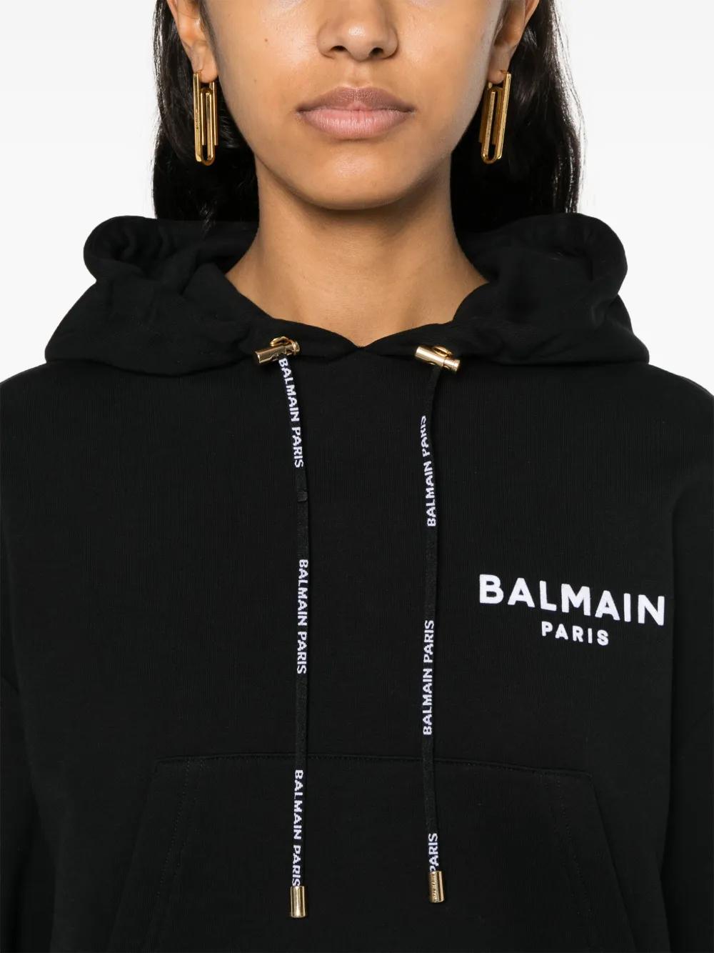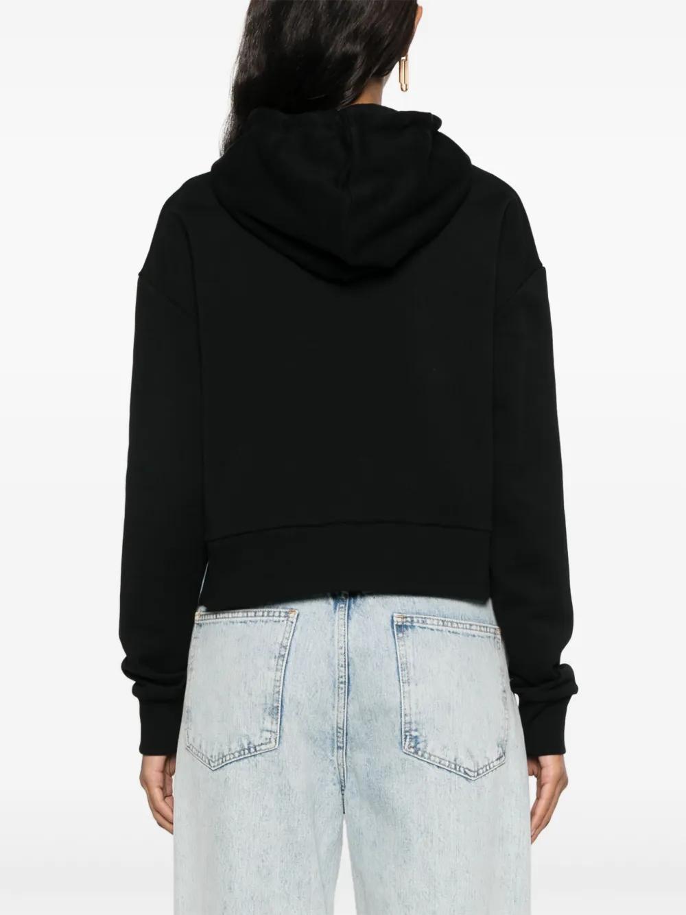 black cotton jersey texture drawstring hood flocked logo front pouch pocket logo-jacquard short side slits drop shoulder long sleeves ribbed cuffs and hem