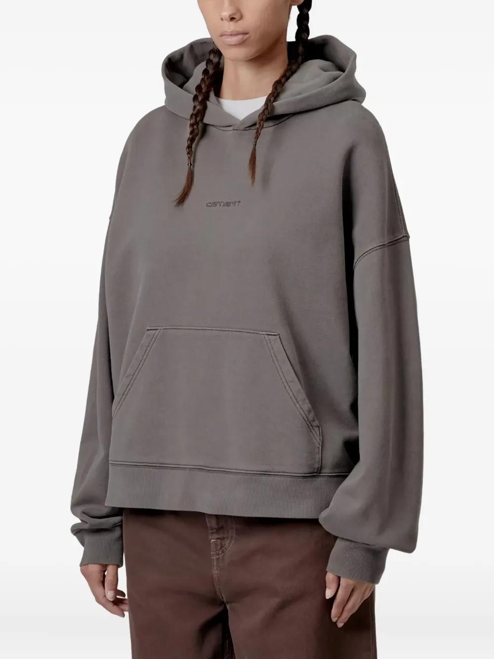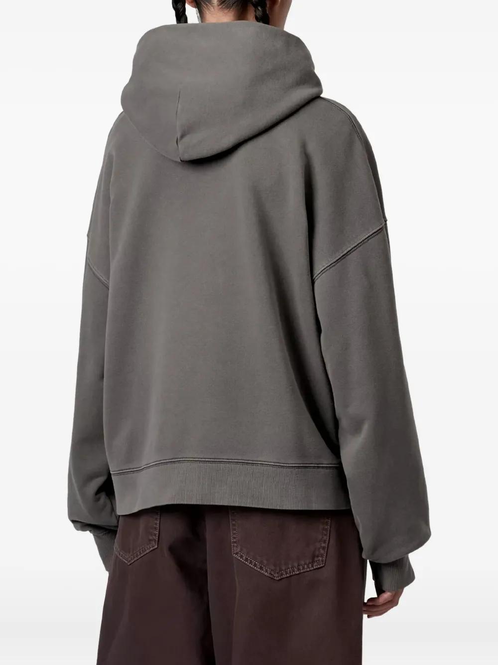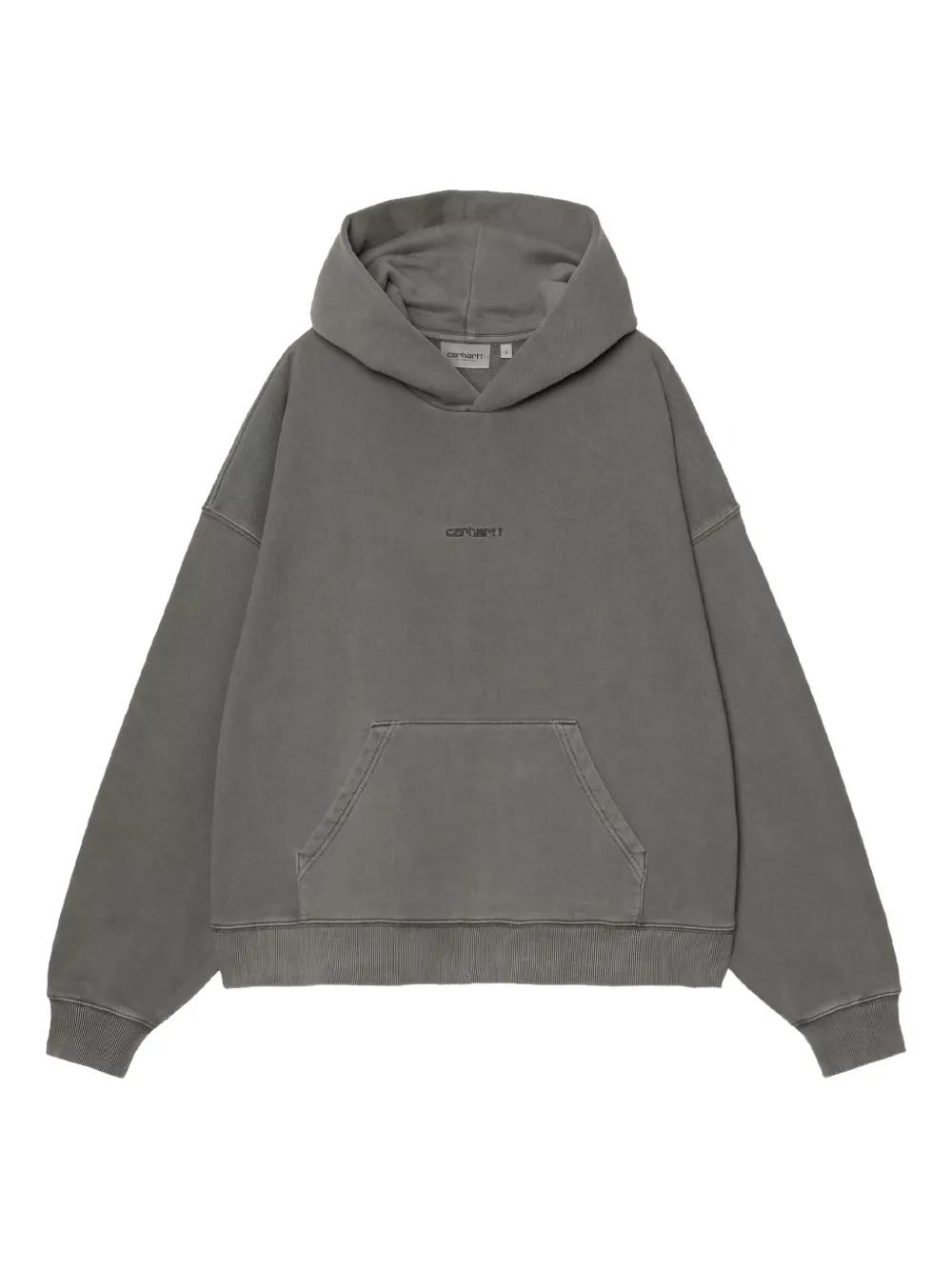 graphite grey fixed hood front pouch pocket long sleeves embroidered logo ribbed trim cotton