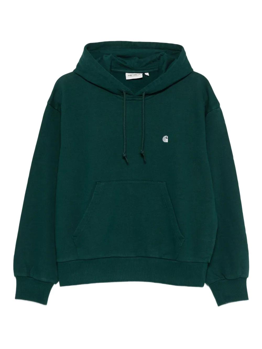 dark green hooded neckline kangaroo pocket long sleeves relaxed fit small logo embroidery
