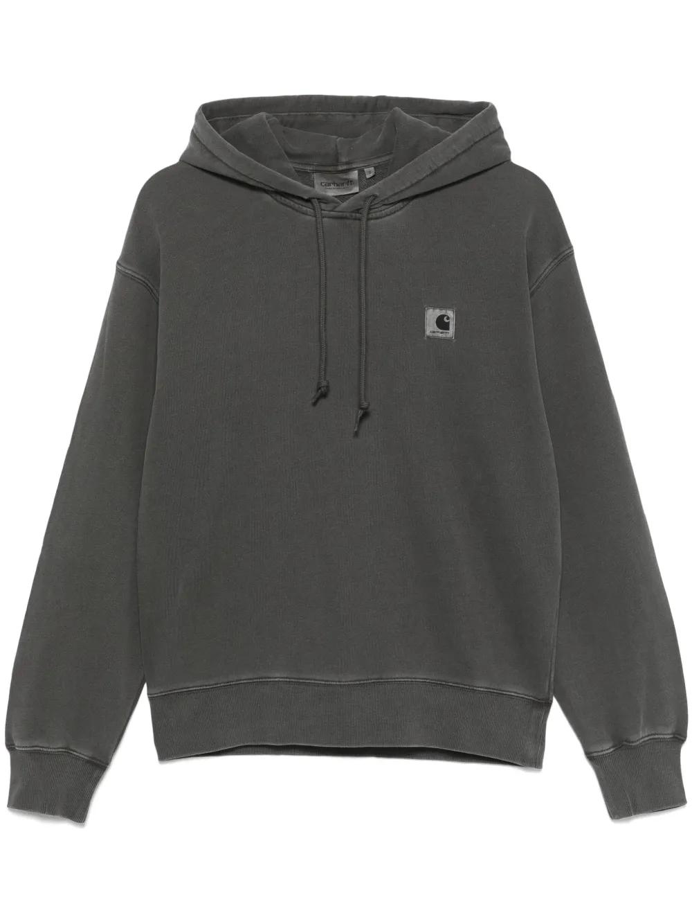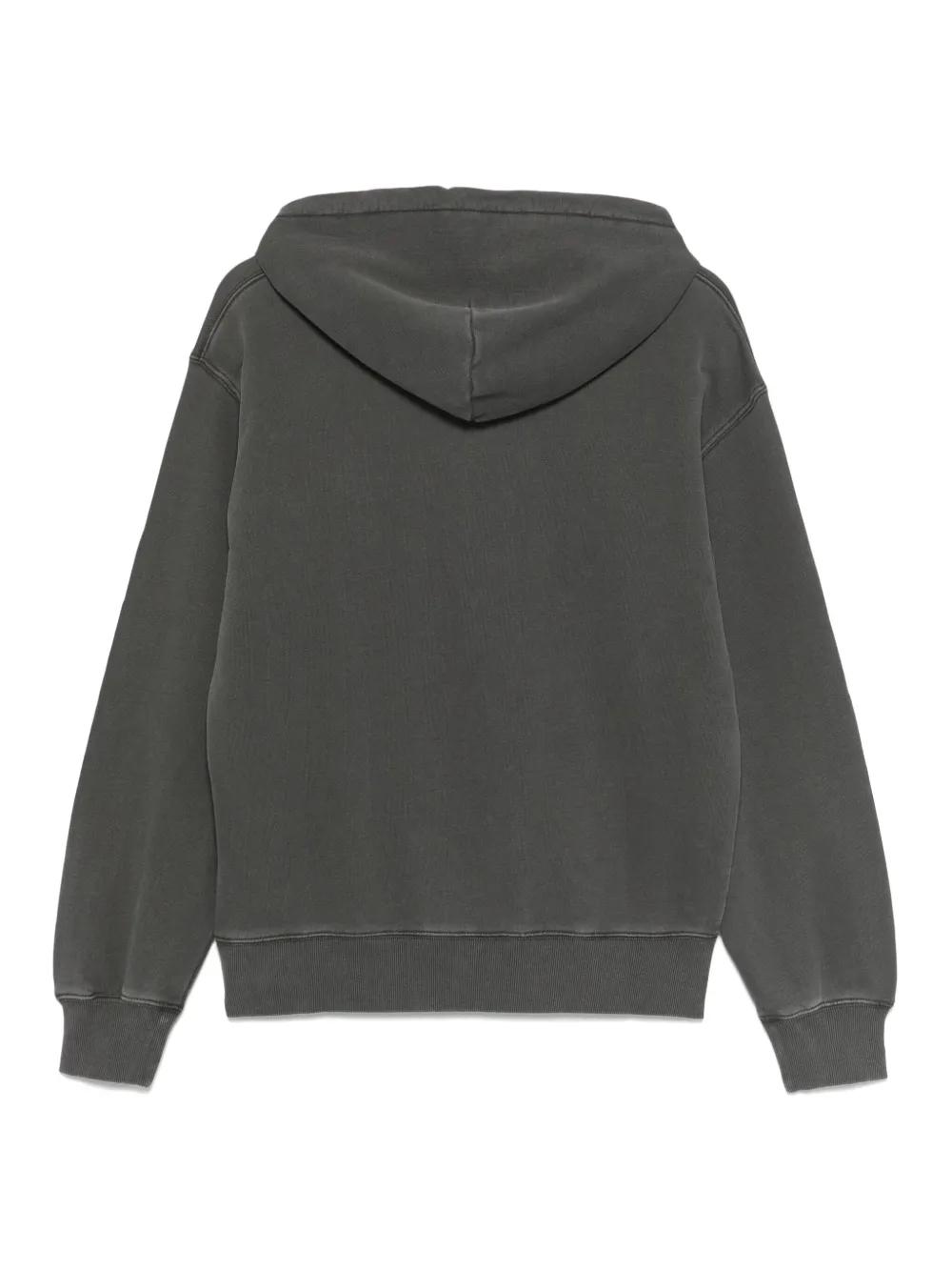 anthracite grey cotton jersey texture garment dyed faded effect drawstring hood drop shoulder long sleeves logo tag French terry lining ribbed cuffs and hem