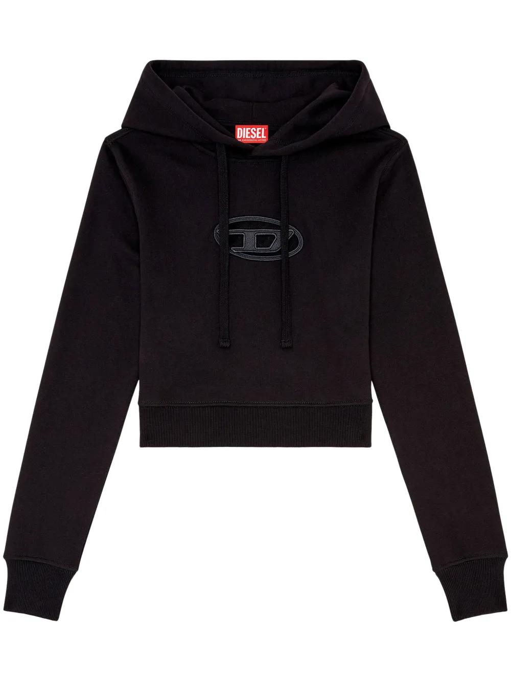 black cotton blend logo print to the front drawstring hood long sleeves ribbed cuffs and hem cropped