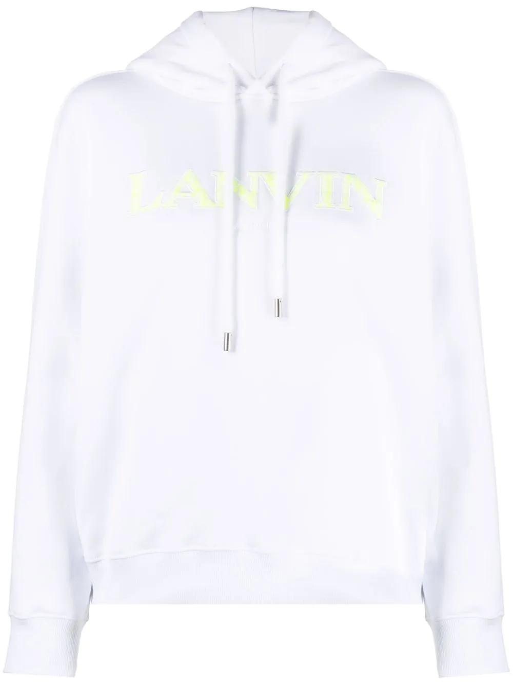white cotton embroidered logo to the front drawstring hood drop shoulder long sleeves ribbed cuffs ribbed hem