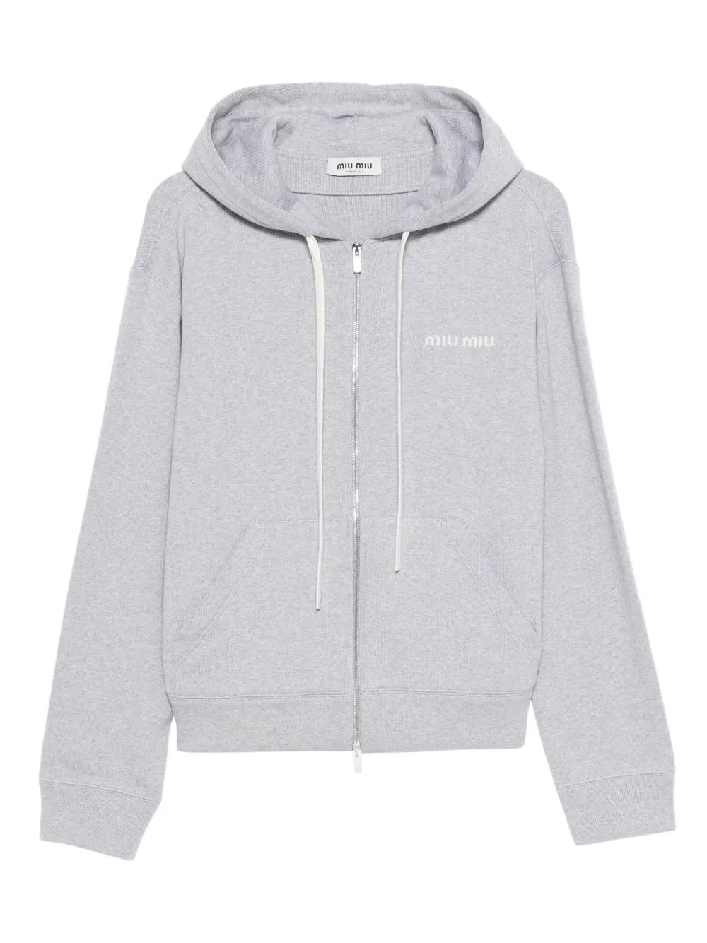 grey drawstring hood zip fastening long sleeves logo embroidery