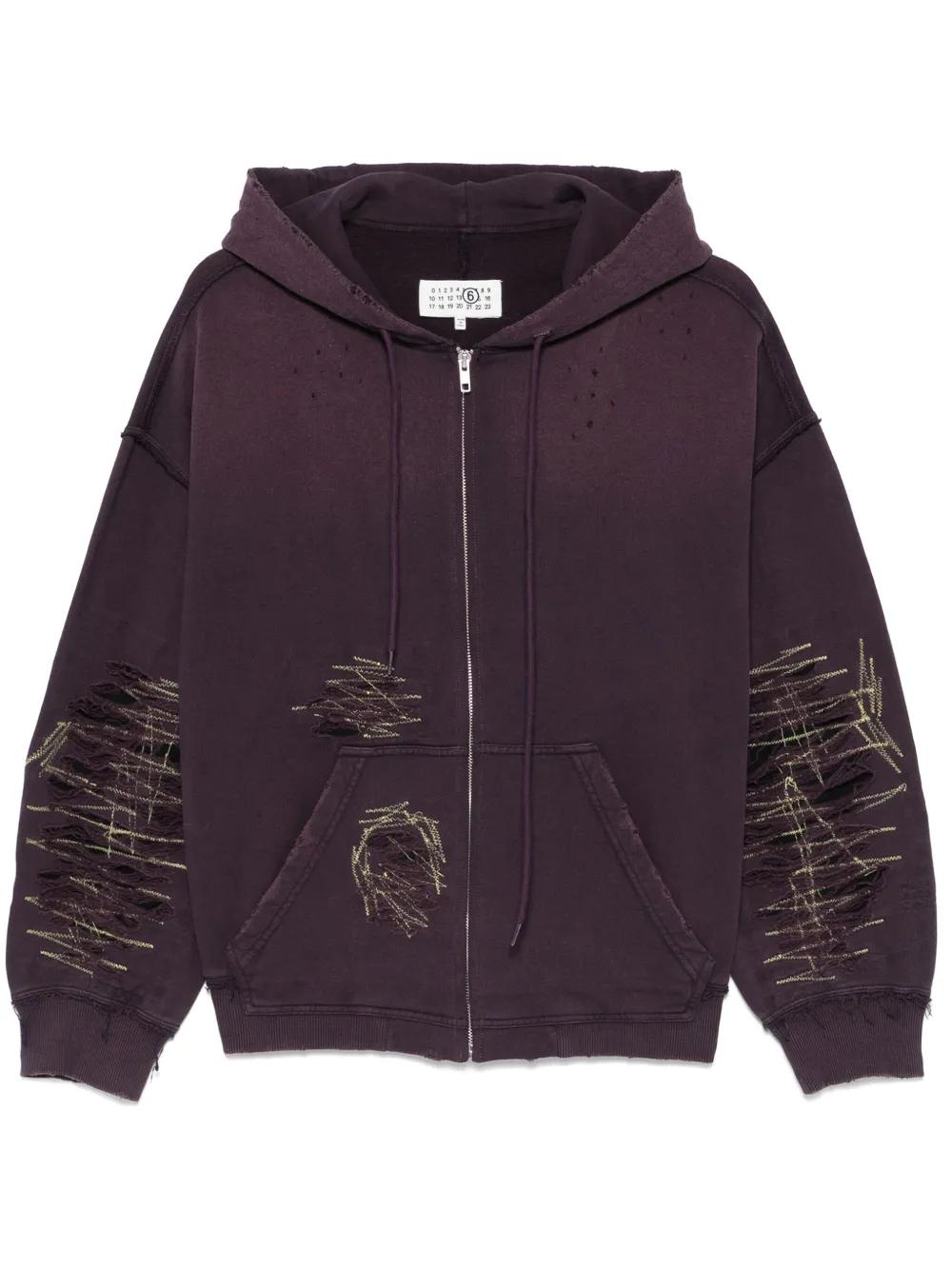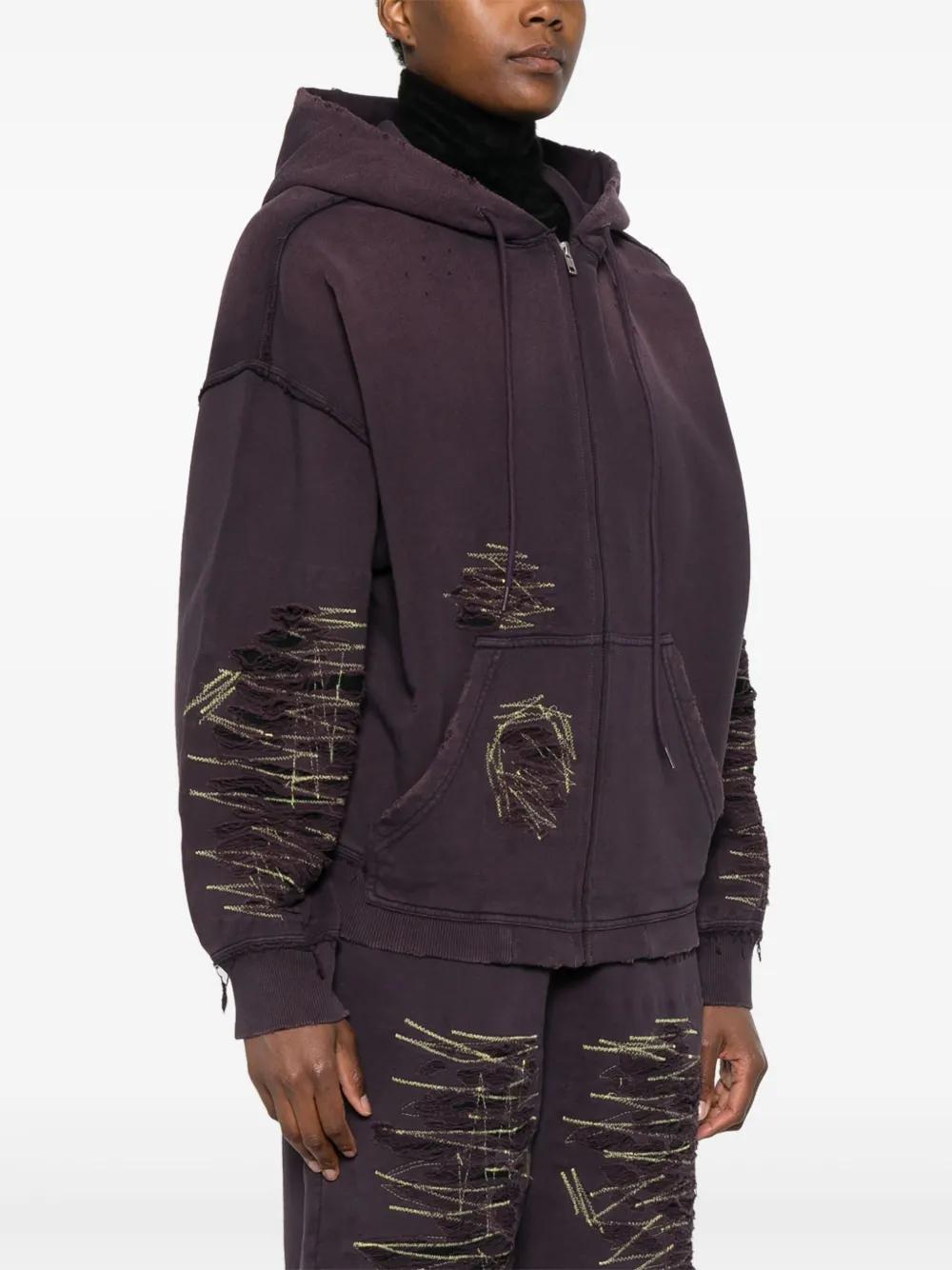 purple cotton jersey texture distressed finish seam detailing front zip fastening drawstring hood drop shoulder long sleeves ribbed cuffs and hem two front pouch pockets rear signature single-stitch logo straight hem