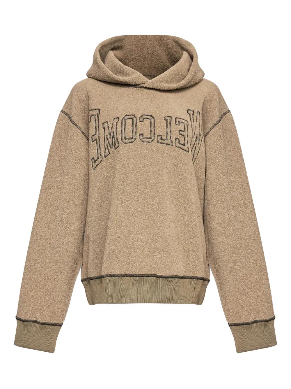 beige embroidered text fixed hood ribbed hem contrast stitching