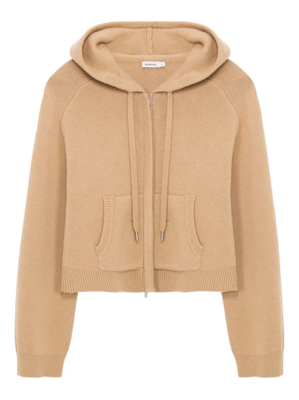 camel brown hooded neckline zip fastening long sleeves kangaroo pocket cropped