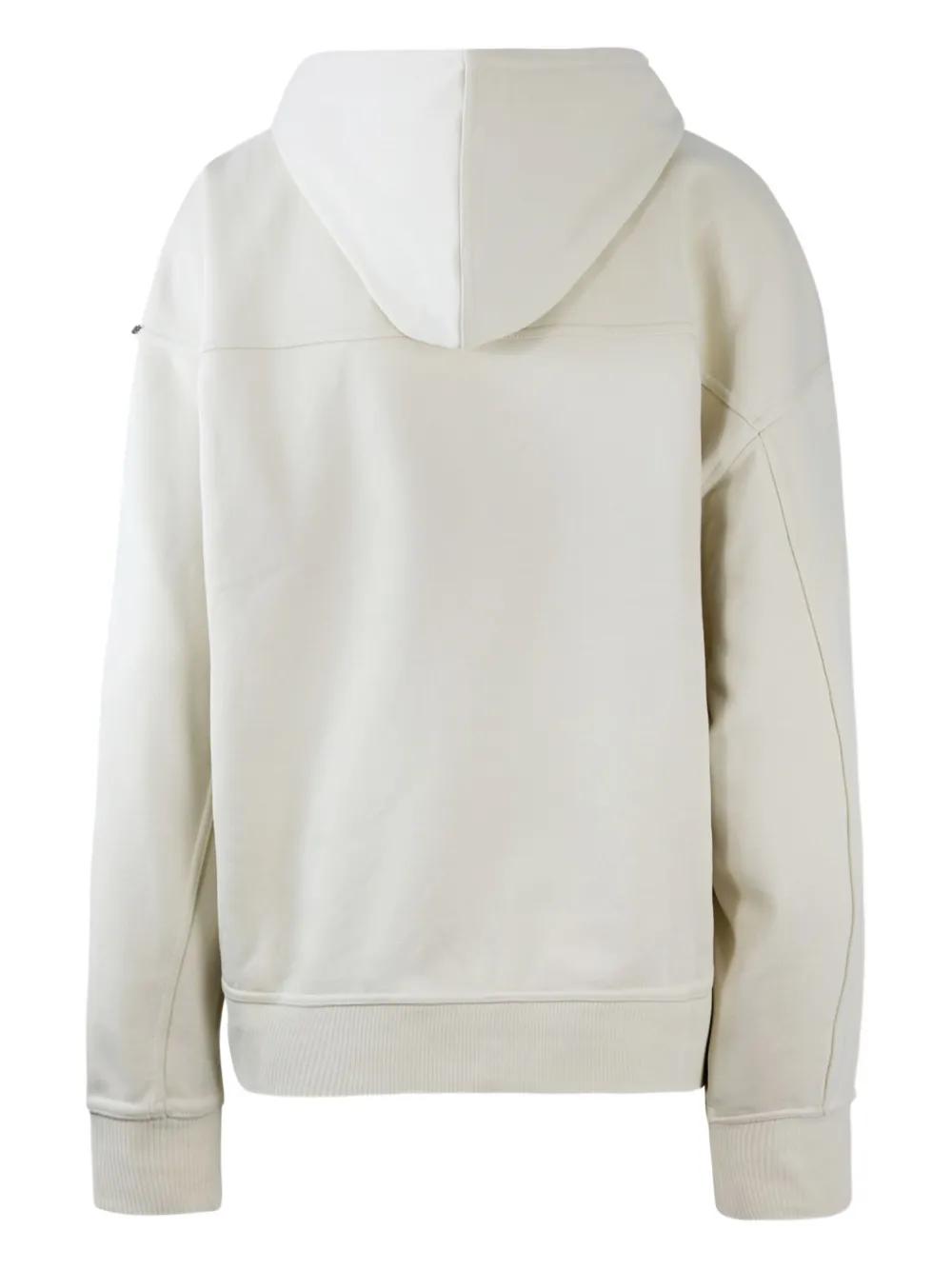 ivory drawstring hood logo plaque dropped shoulder long sleeves ribbed cuffs