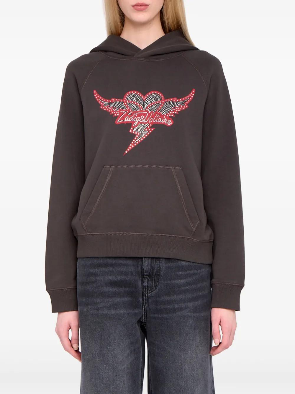 grey heart wings graphic strass embellishment drawstring hood long sleeves front pouch pocket