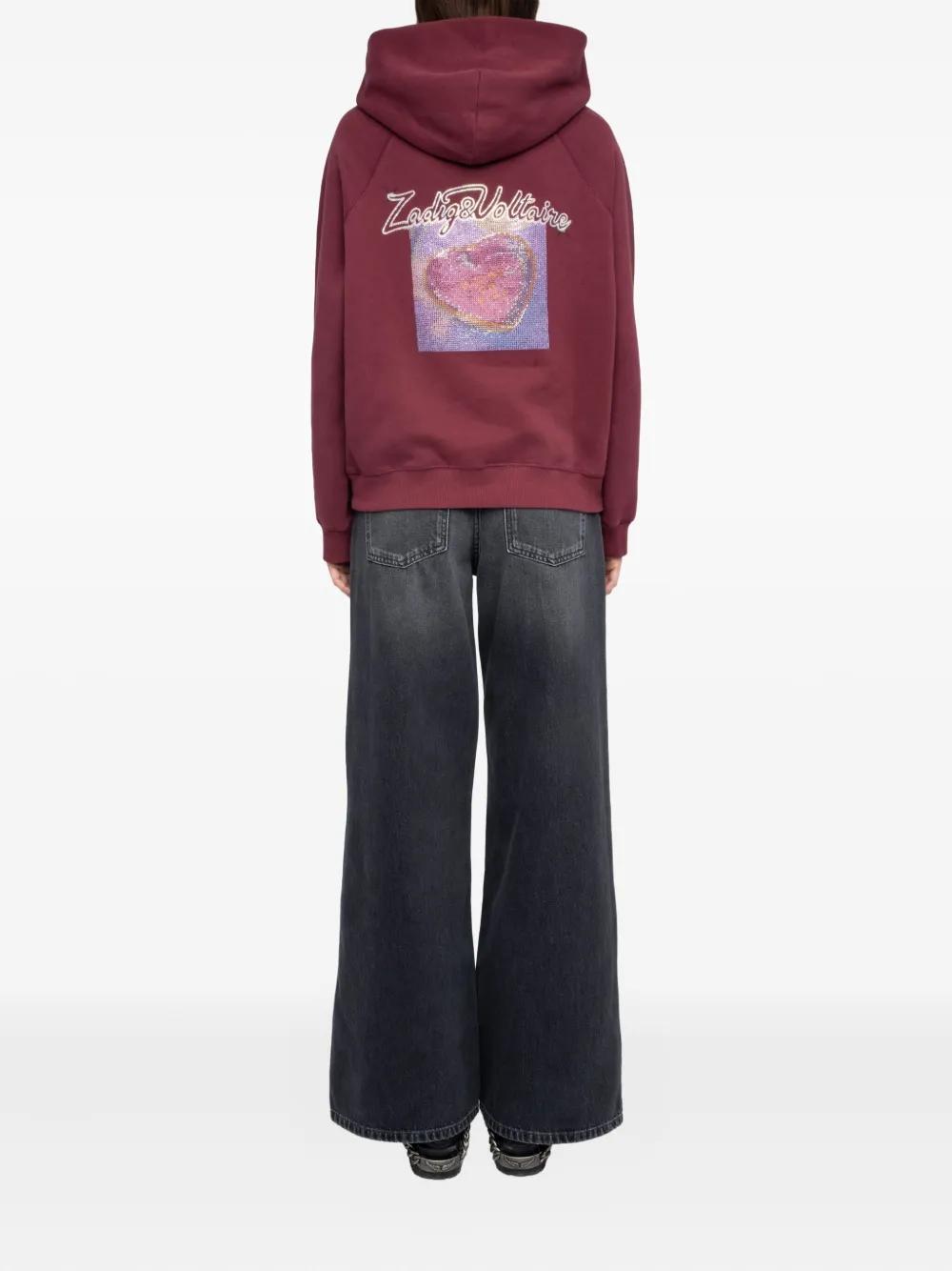 burgundy strass embellishment kangaroo pocket hood long sleeves graphic print to the rear
