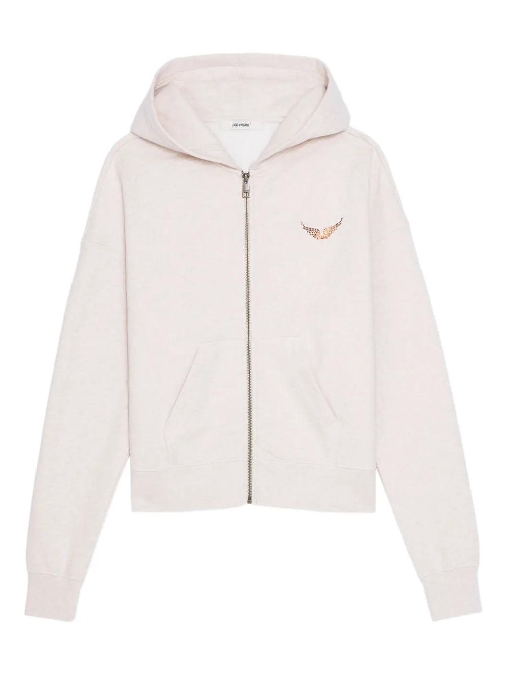 beige embroidered wing logo front zip fastening long sleeves kangaroo pocket